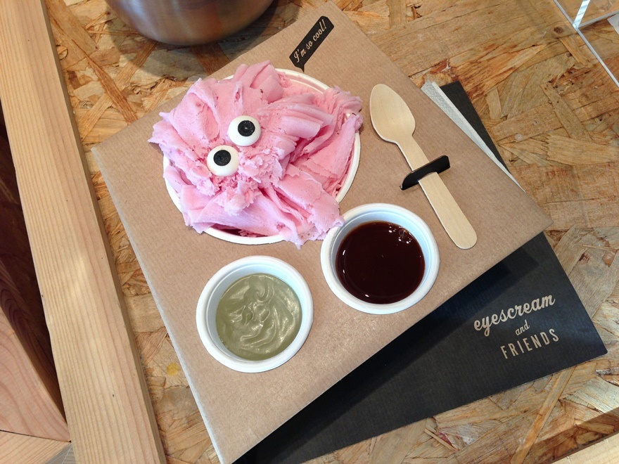 Di maggiore impatto per come si presenta e per l’invenzione che c’è dietro è invece il progetto Eyescream, di una gelateria di Barcellona. Dall’anonimo shaved ice cream, gelato Taiwandese ottenuto raschiando del ghiaccio e guarnendolo con diverse creme e sciroppi, all’idea innovativa di sostituire il ghiaccio con del gelato italiano ghiacciato, separarlo dalle guarnizioni e porci sopra due occhi di zucchero che vanno così a creare dei simpatici mostri da guastarsi. Il packaging del prodotto è semplice e minimale: un vassoio elegante in cui viene posto sia il new shaved ice cream che le guarnizioni che si desiderano, arricchito da frasi simpatiche che danno vita al gelato-mostriciattolo.