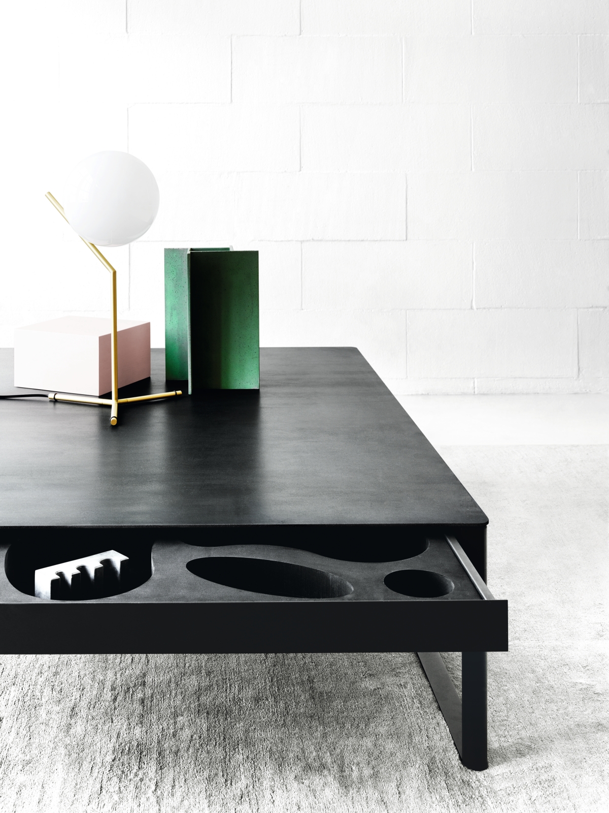Il tavolino Icaro 015, disponibile in diverse dimensioni e finiture, riprende la silhouette sottile e discreta del tavolo, mentre le “slitte” di raccordo per le gambe gli conferiscono una linea ancora più geometrica. Anche nella versione “small”, Icaro 015 alloggia sotto il piano i cassetti che, posizionati a filo del top, diventano quasi strutturali: accessori funzionali che non ne pregiudicano l’estetica.