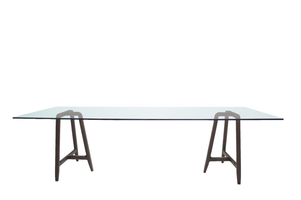 Un piano in cristallo o in noce Canaletto, sospeso tra due strutture lignee; il risultato è un tavolo di grande raffinatezza, grazie all’eleganza dei dettagli e alla leggerezza del suo insieme.