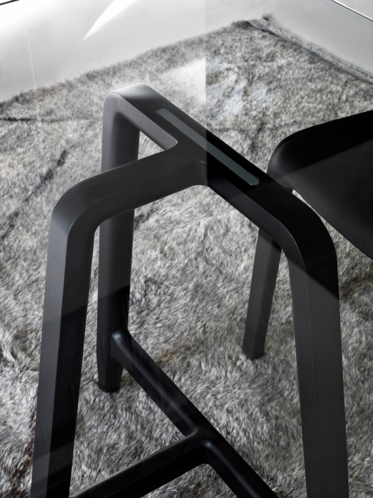 Ad arricchire la serie di sedute si aggiungono gli sgabelli proposti in due varianti, con e senza schienale. I tavoli con piano in noce canaletto e struttura tubolare in acciaio sono proposti nella versione a sbalzo e a filo, come lo scrittoio e il tavolo basso.