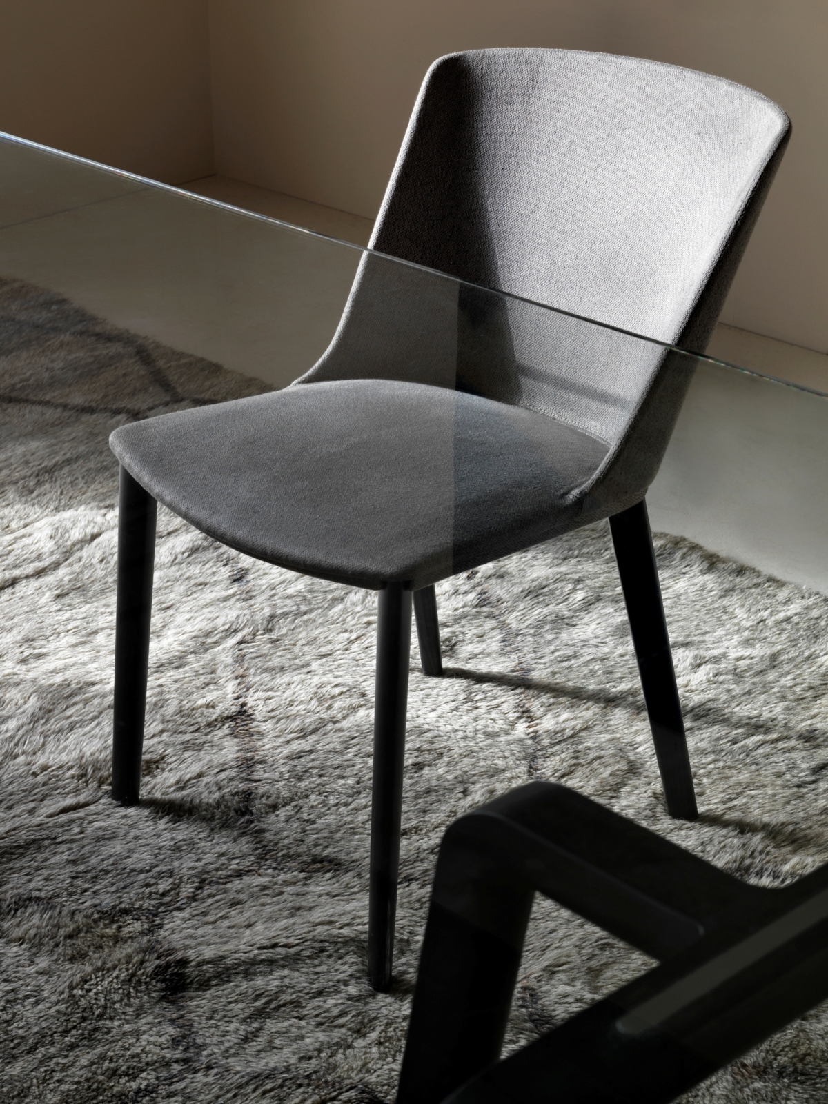 Le sedute si ispirano non a caso all’archetipo dell’antica sedia cinese, originariamente in legno, e si declinano in sedia, poltrona e poltroncina bassa con seduta in cuoio realizzata nelle stesse tonalità delle strutture metalliche.