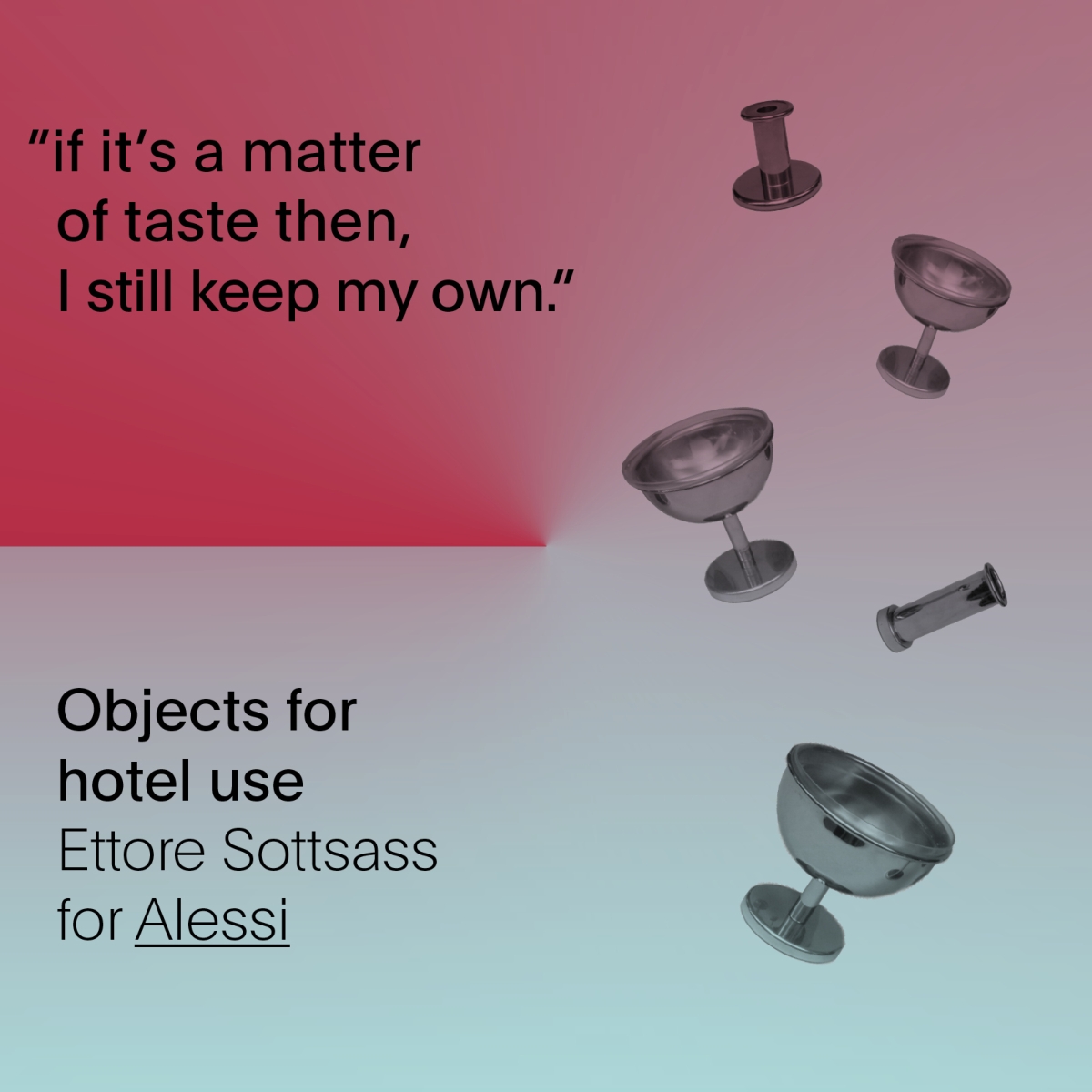 Collocata nella sala principale del primo piano della Cascina (denominata Galleria), la mostra collettiva comprende pezzi unici di maestri come Aldo Rossi, Alessandro Mendini, Ettore Sottsass, Marco Zanuso, Anna Castelli e Richard Sapper, con la partecipazione delle istituzioni museali di prestigiosi brand come Alessi e Kartell. Oltre a questi, noti designer contemporanei come Riccardo Blumer e Franceso Faccin raccontano il loro approccio alla progettazione, esponendo prototipi che illustrano le diverse fasi dei loro processi di ricerca.