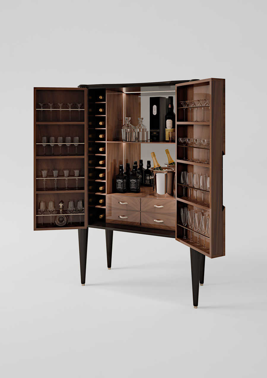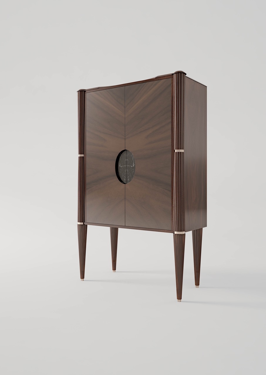 Una struttura realizzata interamente in legno massello di noce, ante e cassetti in palissandro, disponibili in differenti finiture: il mobile bar della nuova collezione Ellipse è perfetto per avere a portata di mano vino, bevande e distillati. Le due ante suddivise in vani contengono spazi attrezzati ideali per disporre calici e bicchieri. La parte centrale, oltre a quattro cassetti utili per riporre gli strumenti per cocktail o per la decantazione del vino e dei liquori, è composta da due colonne dove riporre le bottiglie in posizione orizzontale. Lo schienale interno è realizzabile a specchio, verniciato o rivestito in pelle Nabuk o velluto, così come dentro ai cassetti. Il mobile bar è inoltre illuminato da LED che si accendono automaticamente all’apertura delle ante.