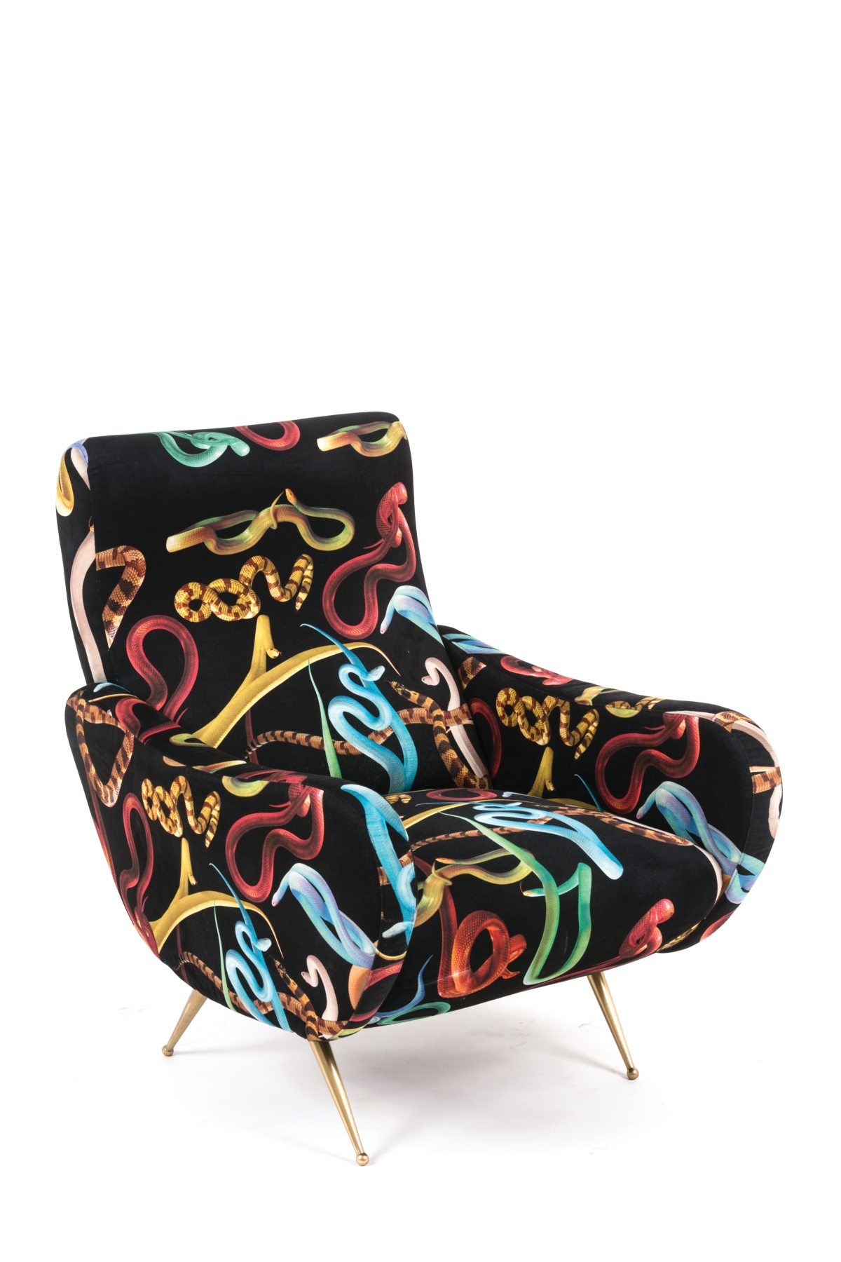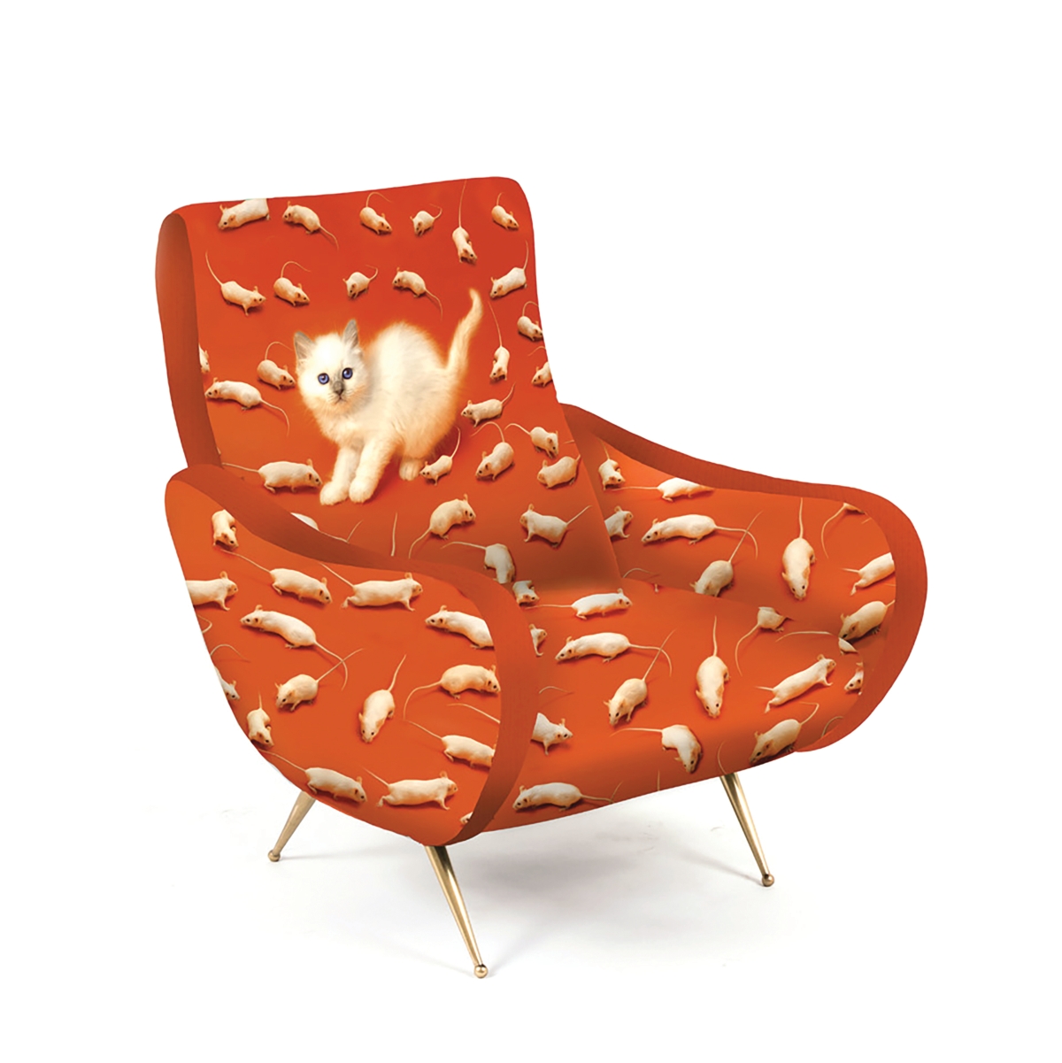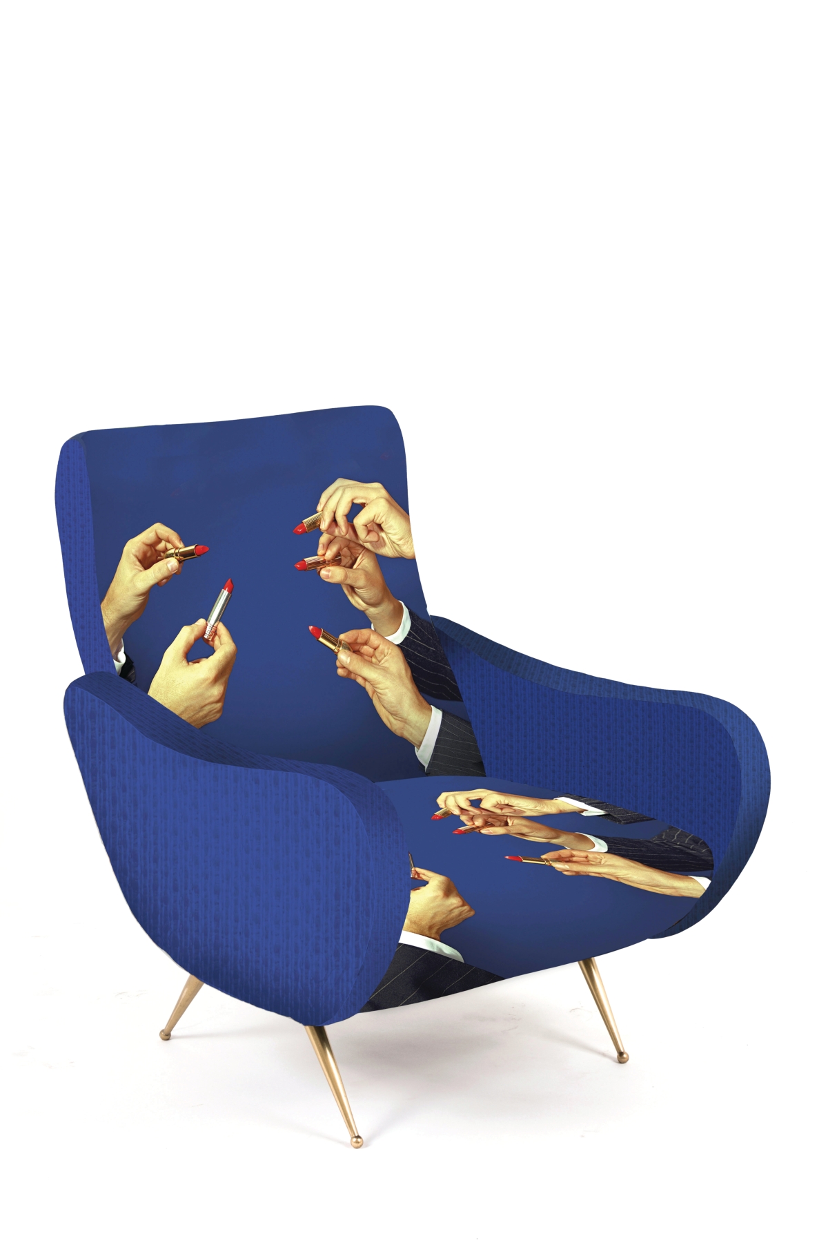 La linea nata in collaborazione con TOILETPAPER, progetto editoriale di Maurizio Cattelan e Pierpaolo Ferrari, è l’emblema di come design e arte possano unirsi dando origine a un immaginario originale e sopra le righe. Al ricco catalogo di oggetti si aggiunge il primo prodotto del mondo degli imbottiti; le nuove poltroncine evocano le tradizionali sedute anni ’50 dalle forme sinuose e i piedini in ottone, che vengono però stravolte da un rivestimento di immagini surreali: un gatto immerso tra pillole (Cat), una colata di spaghetti al pomodoro (Spaghetti), fiori borchiati (Flowers with Holes), mani maschili che impugnano rossetti (Lipsticks), serpenti striscianti (Snakes).