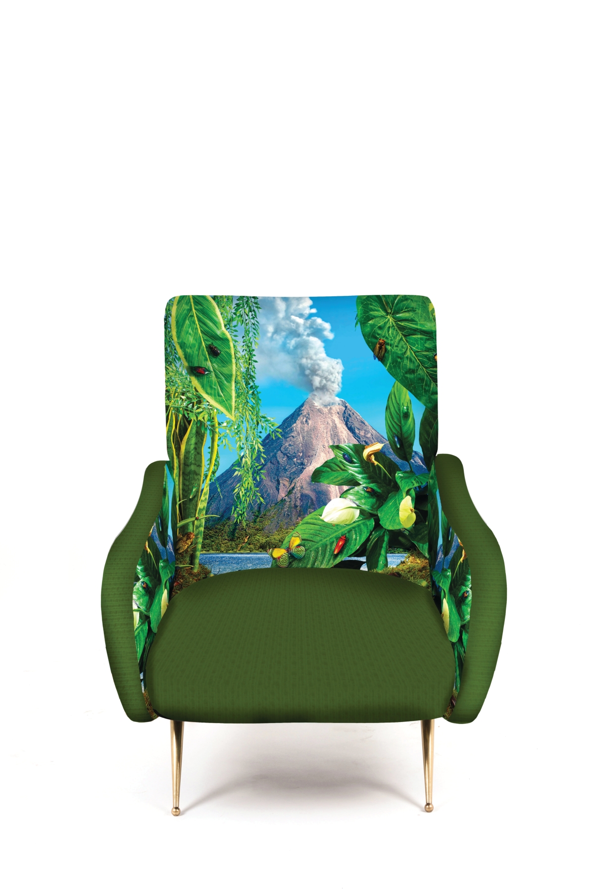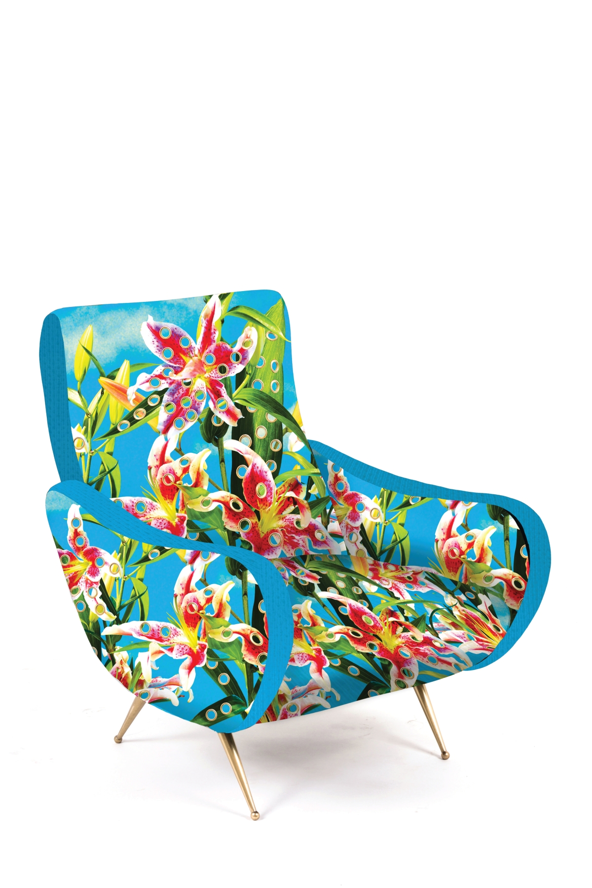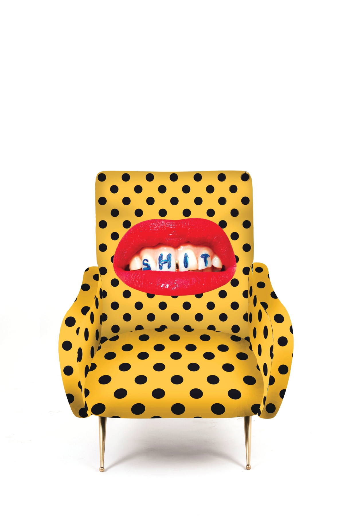 La linea nata in collaborazione con TOILETPAPER, progetto editoriale di Maurizio Cattelan e Pierpaolo Ferrari, è l’emblema di come design e arte possano unirsi dando origine a un immaginario originale e sopra le righe. Al ricco catalogo di oggetti si aggiunge il primo prodotto del mondo degli imbottiti; le nuove poltroncine evocano le tradizionali sedute anni ’50 dalle forme sinuose e i piedini in ottone, che vengono però stravolte da un rivestimento di immagini surreali: un gatto immerso tra pillole (Cat), una colata di spaghetti al pomodoro (Spaghetti), fiori borchiati (Flowers with Holes), mani maschili che impugnano rossetti (Lipsticks), serpenti striscianti (Snakes).