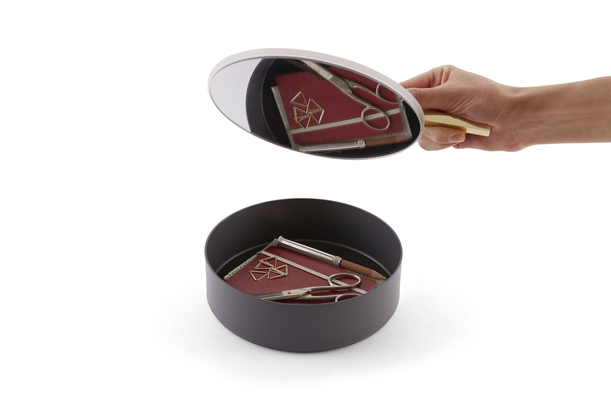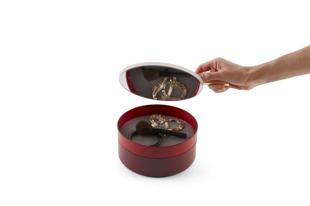 Il coperchio infatti, impreziosito da un piccolo manico in ottone, nasconde internamente uno specchio circolare, elemento che soddisfa l’innata passione umana per l’apparire.