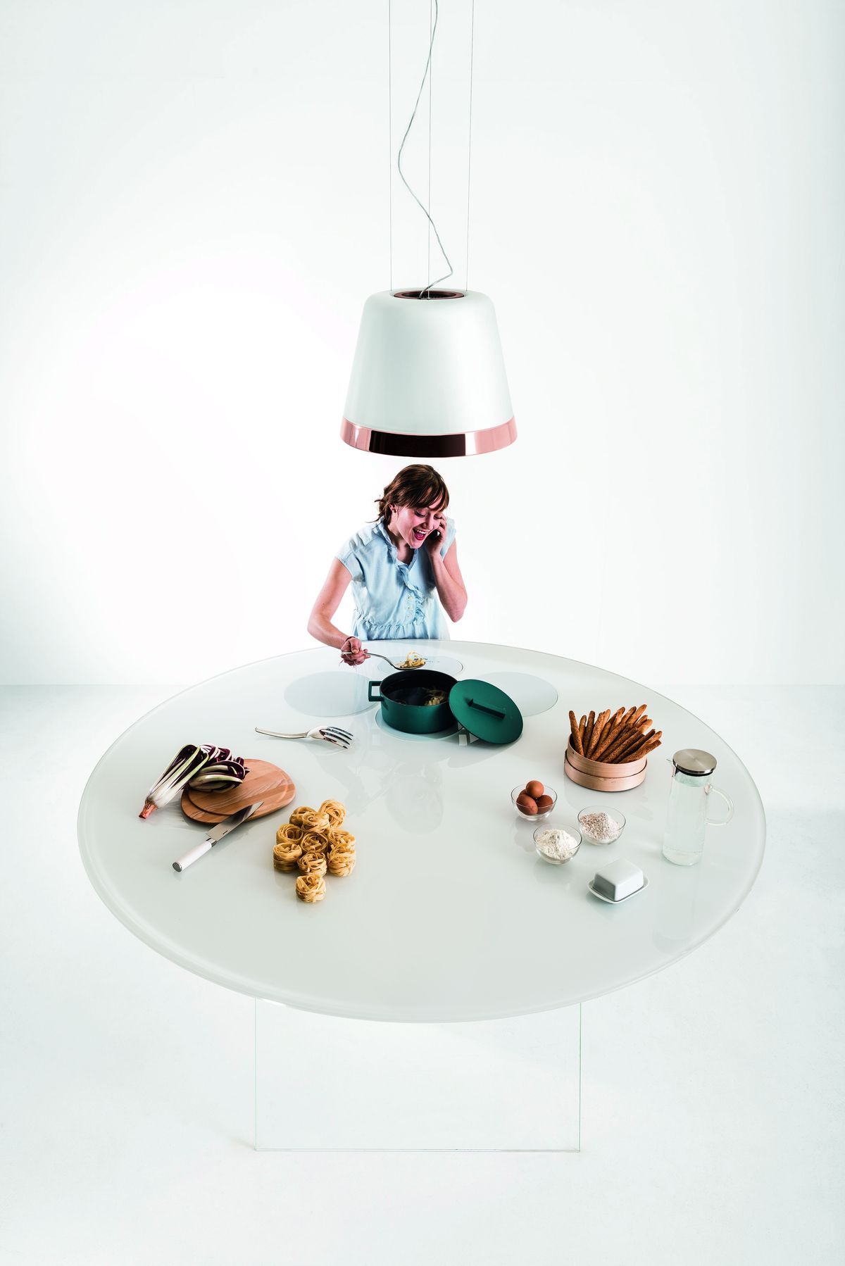 Sospesa su gambe in vetro, con piano di cottura a induzione e abbinabile al sistema cucina 36e8 in soluzioni a isola e penisola, la nuova cucina di LAGO verrà presentata durante la fiera in abbinamento alla cappa lampadario di Elica Summilux in vetro bianco con finitura in metallo effetto rame lucido, disegnata da Fabrizio Crisà. La nuova cappa Elica crea il giusto equilibrio tra emozione e tecnologia, rendendo il prodotto ideale per essere installato sulla cucina Air. La doppia illuminazione a LED della cappa, che dà la possibilità di modulare l’intensità della luce ambiente e allo stesso tempo di avere un disco LED direzionato verso il piano cottura, fa si che la luce sia protagonista. Regolabile con un comodo telecomando e arricchita da filtri odori altamente performanti e di facile rimozione, Summilux è dotata di sensori in grado di rilevare il tipo di cottura e la quantità di vapori emessi, calibrando così in modo ottimale il livello di aspirazione necessario.