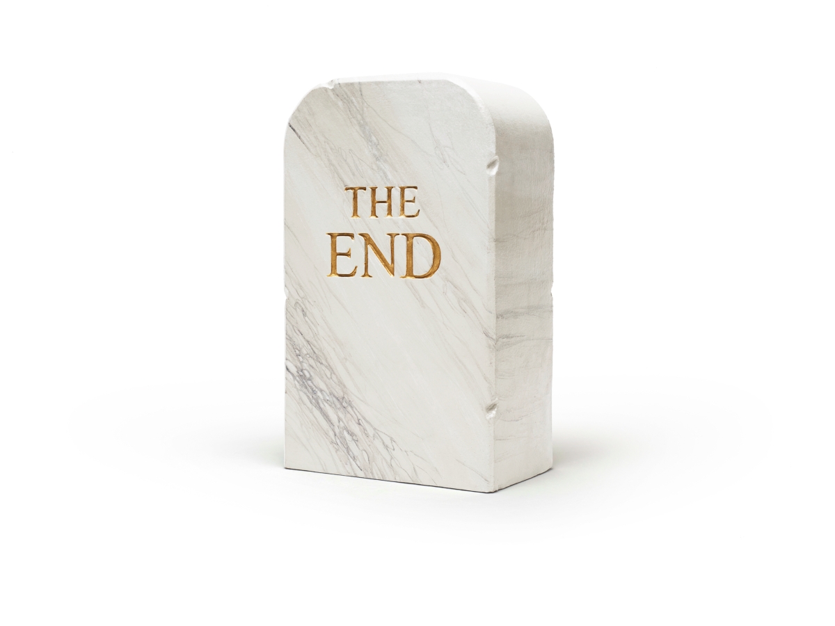 THE END 1516, esposto in anteprima a Miami durante l’Art Week, riprende gli stilemi dell’ironico epitaffio creato da Maurizio Cattelan e Pierpaolo Ferrari per sancire la “fine” del marchio Gufram, ma anche per suggerirne un nuovo inizio. Questa serie limitata in 500 pezzi è prodotta in “vero-finto” marmo di Carrara con scritta in oro: un virtuosismo realizzato grazie al Guflac che impreziosisce questo irriverente memento mori.
