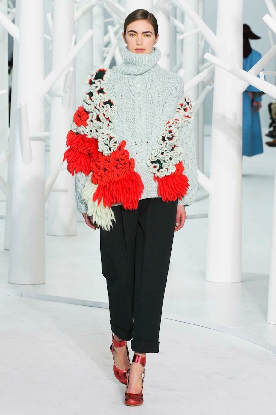 Pizzi e ricami invadono top e vestiti iper femminili simili a lingerie, per outfit seducenti. I maglioni sono ancora over si indossano con i jeans, ma anche sulle gonne e a volte si trasformano in capolavori simili a sculture.