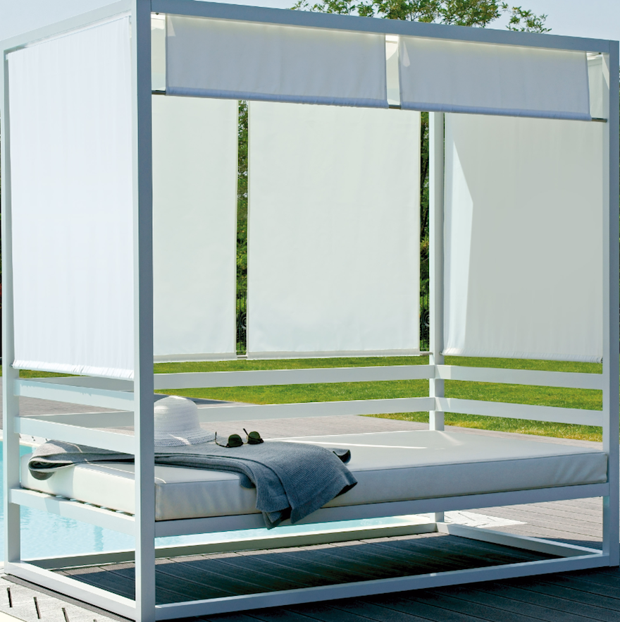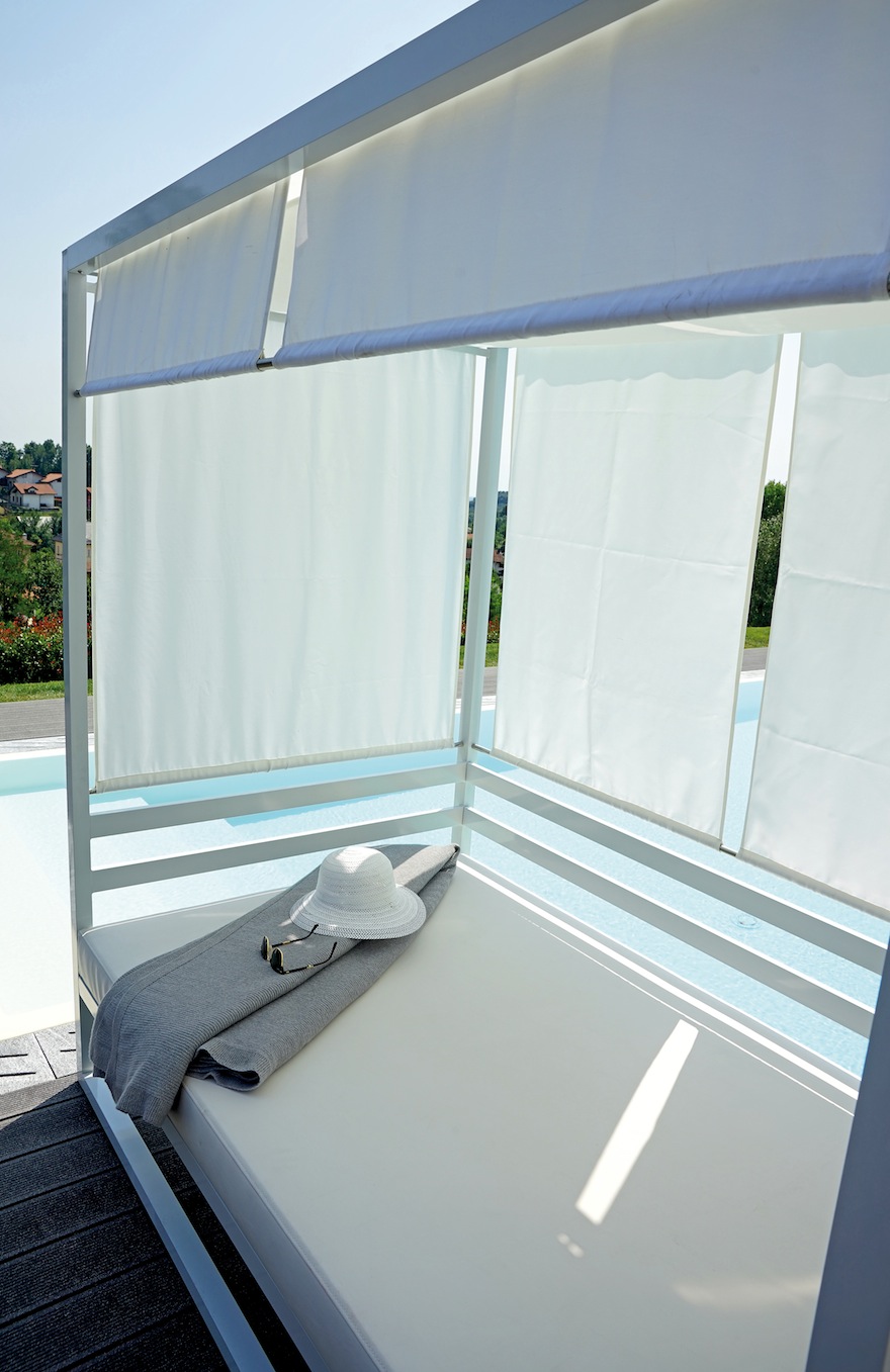 Nasce così il letto a baldacchino di Greenwood: un elemento tradizionale, che diventa moderno, grazie sia al design sobrio e lineare, che ai materiali utilizzati, l’alluminio per la struttura ed il pvc per il cuscino, le cui proprietà di resistenza ed inattaccabilità dagli agenti atmosferici, inoltre, ne valorizzano l’uso all’aperto, e soprattutto a bordo piscina. In questo modo, il baldacchino total white di Greenwood oltre ad essere un’invitante oasi ombreggiata su cui rilassarsi, dona un tocco ricercato all’outdoor.