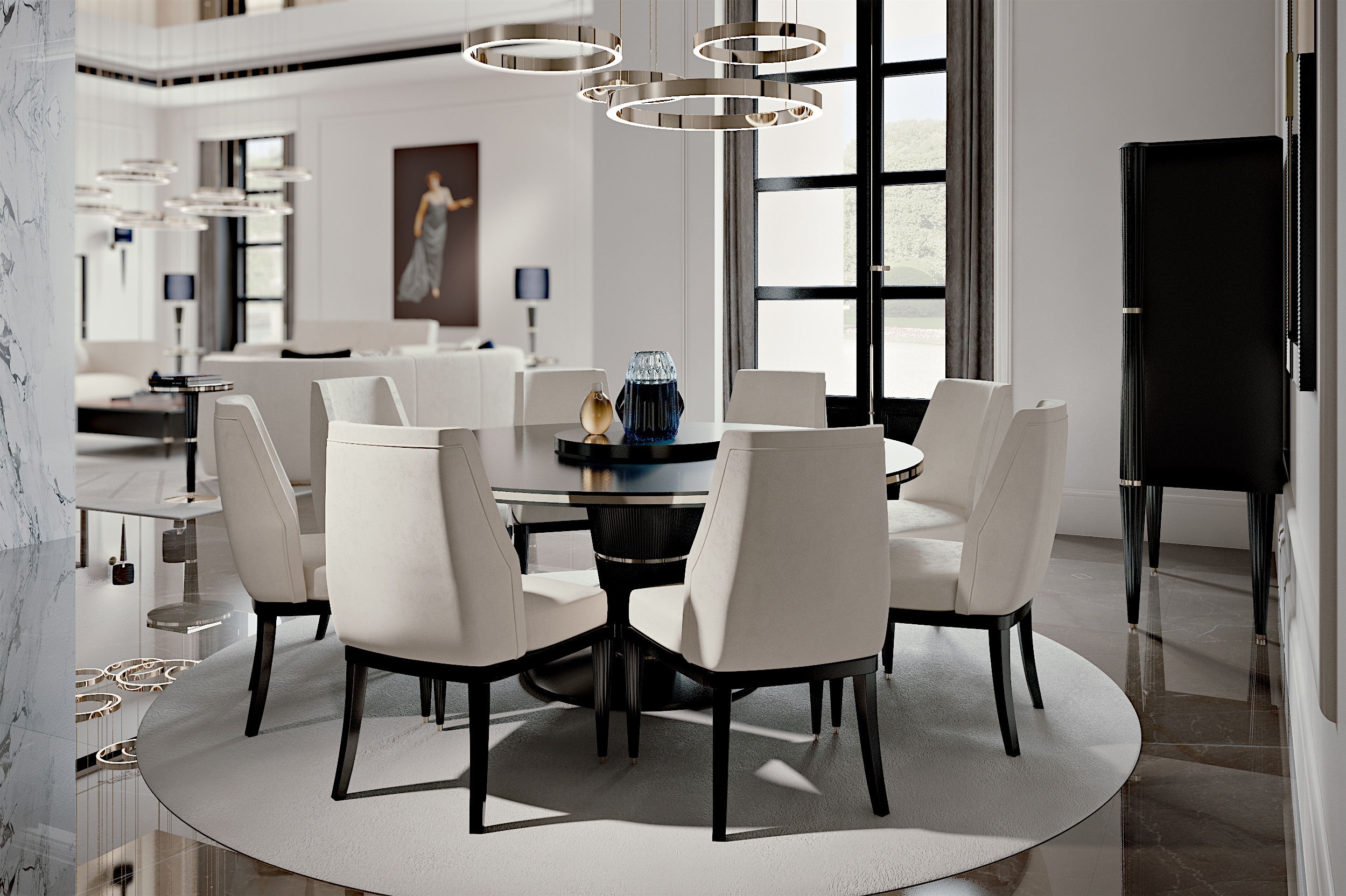 Legni pregiati, come il palissandro, si fondono con inserti metallici, marmorei ed in pelle, che conferiscono alle linee delicate degli arredamenti una contemporaneità versatile, capace di stupire e catturare lo sguardo, tipica dell’estro creativo del Made in Italy che rinnova la classicità.