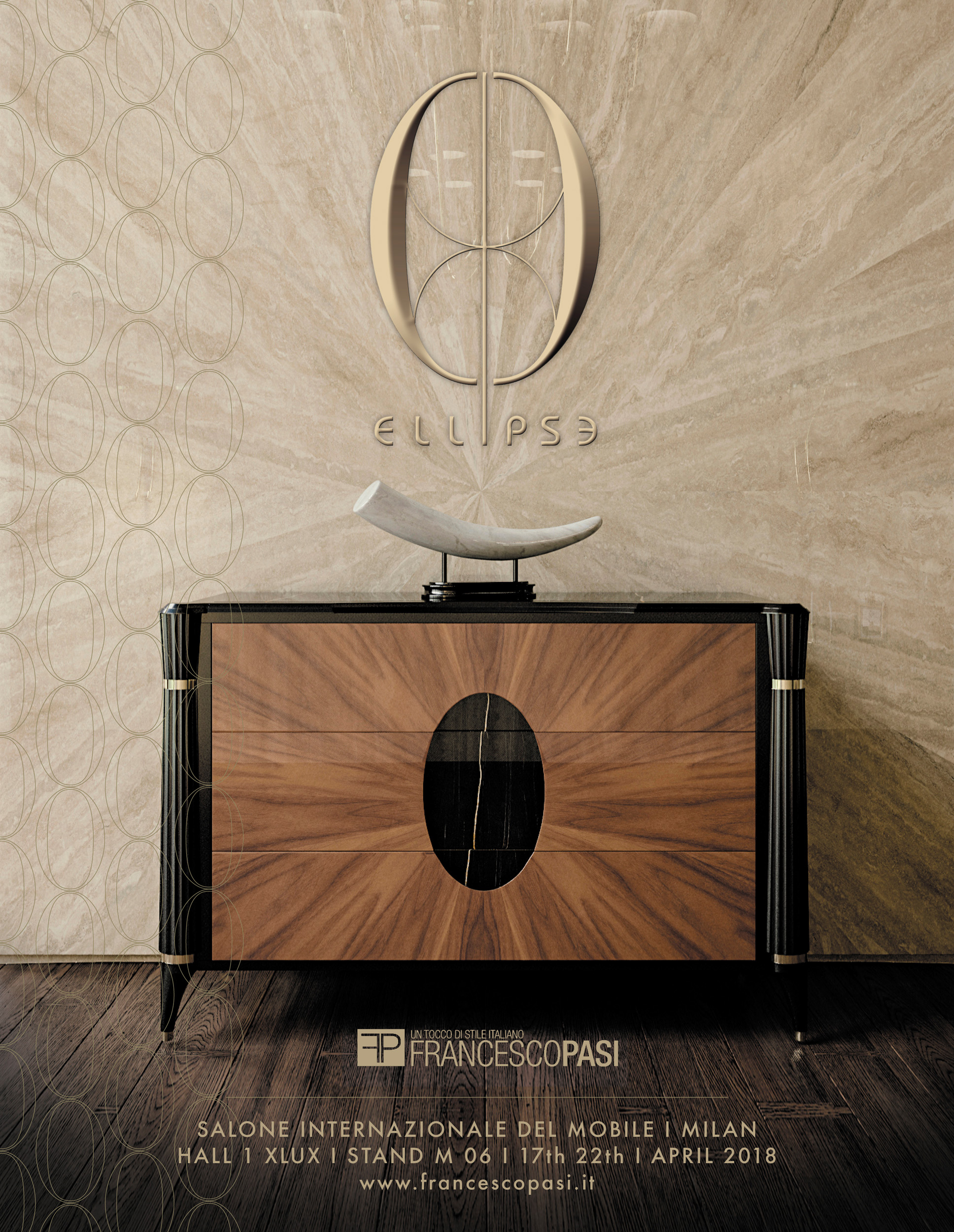 Il design concept 2018 di Francesco Pasi si veste di raffinate geometrie e gioca con abbinamenti materici d’effetto. Lo stile classico, che ha da sempre caratterizzato le creazioni dell’azienda, lascia spazio ad un respiro più contemporaneo e cosmopolita, non tradendo però la sua vocazione all’eleganza timeless. Non solo ambienti ricercati e sofisticati, ma veri e propri spazi da vivere immergendosi nel fascino di un lusso accogliente e su misura, che connota ogni abitazione con un total look inconfondibile. La Collezione Ellipse, che verrà presentata in anteprima durante il Salone del Mobile, offre una continuità di stile per tutta la casa, che accompagna l’occhio dalla zona giorno alla zona notte alla scoperta di un’esperienza abitativa unica.