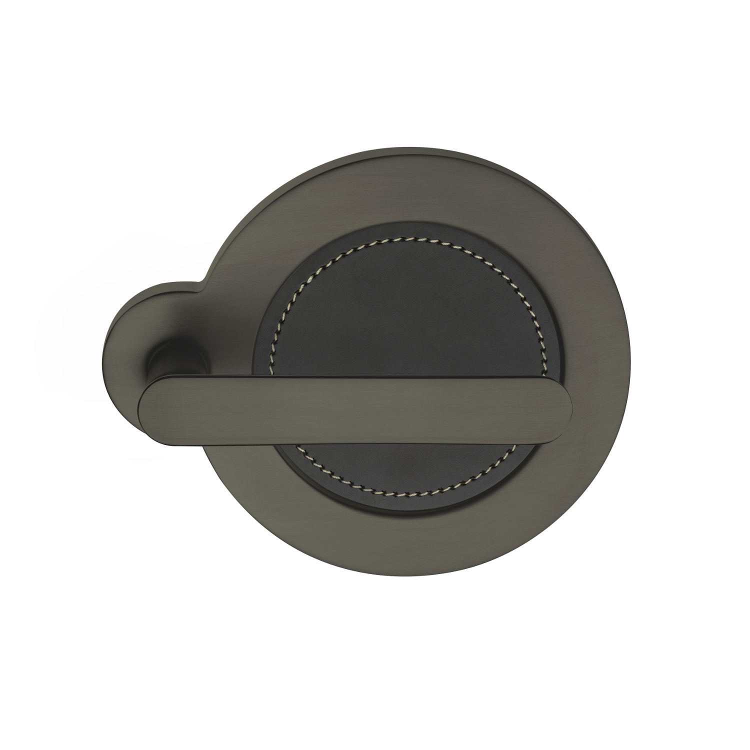 Anche Saturn si distingue per le importanti misure: la sua rosetta è larga 180 mm e alta 152 mm ed è composta da due dischi: uno esterno, a cui è applicata la maniglia, e uno interno disponibile in varie finiture e rivestimenti ed anche personalizzabile con incisioni a laser. La finitura scelta per tutto l’hotel è antracite e pelle nera per il disco interno.