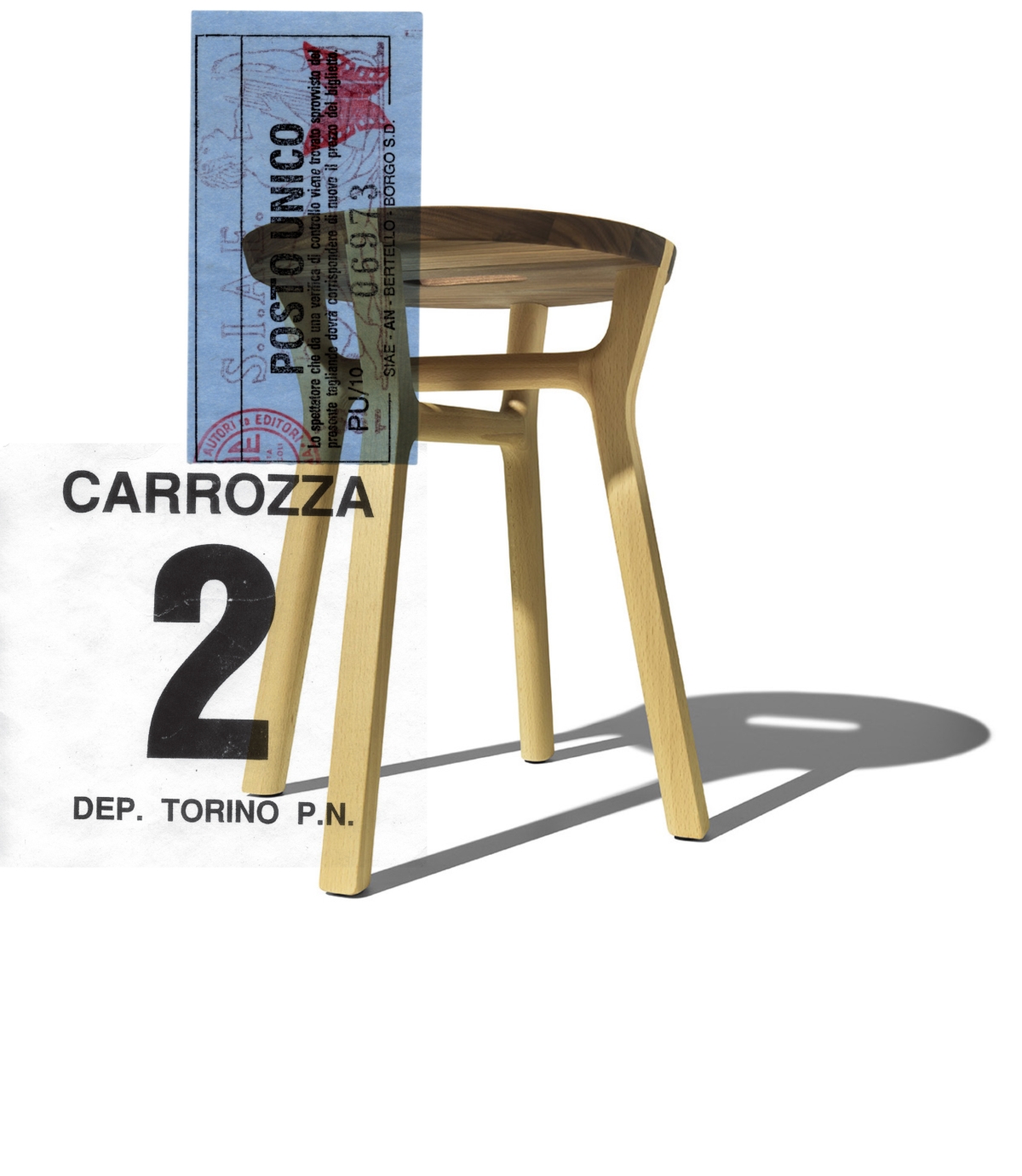 Collage di Leonardo Sonnoli con lo sgabello Affi in legno massello di faggio e noce disegnato da Giulio Iacchetti per Internoitaliano