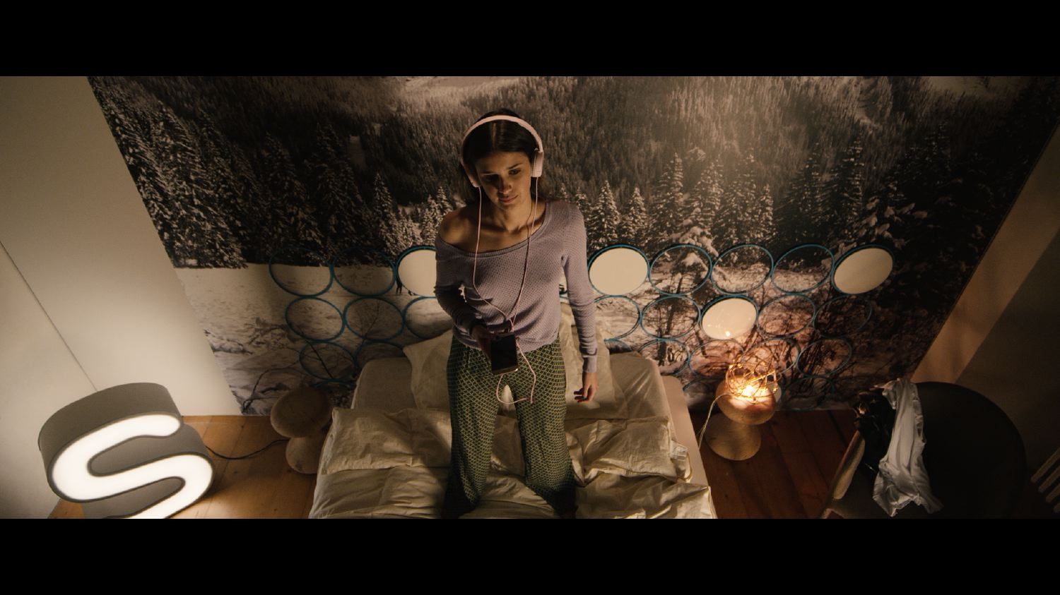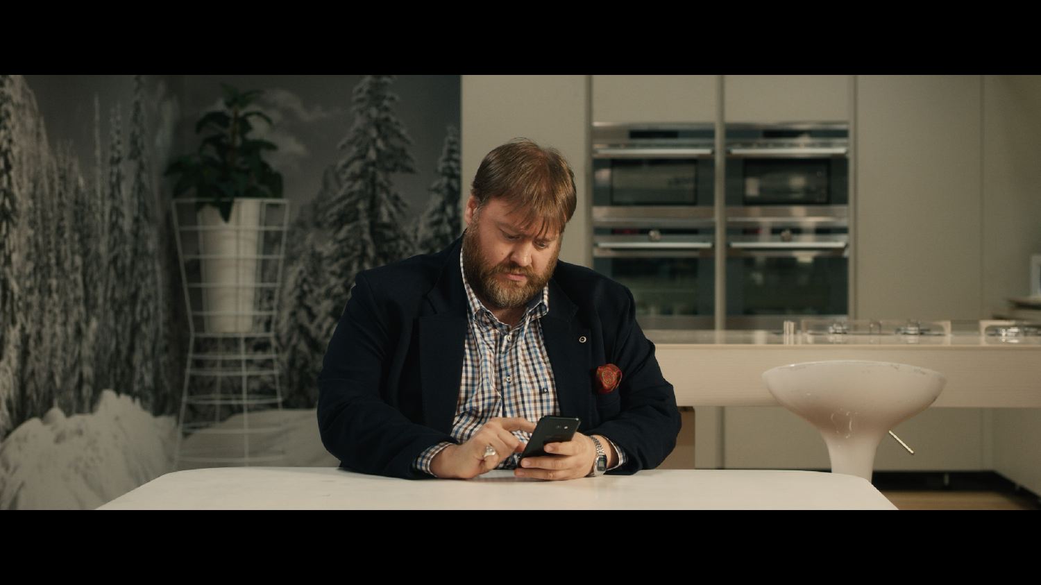Quattro camere da letto, un ufficio, la sala da bagno, l’area living, cucina e sala da pranzo: spazi ampi arredati secondo un mood contemporaneo in gradevole contrasto con le grafiche delle carte da parati, progettate appositamente per le riprese del film.