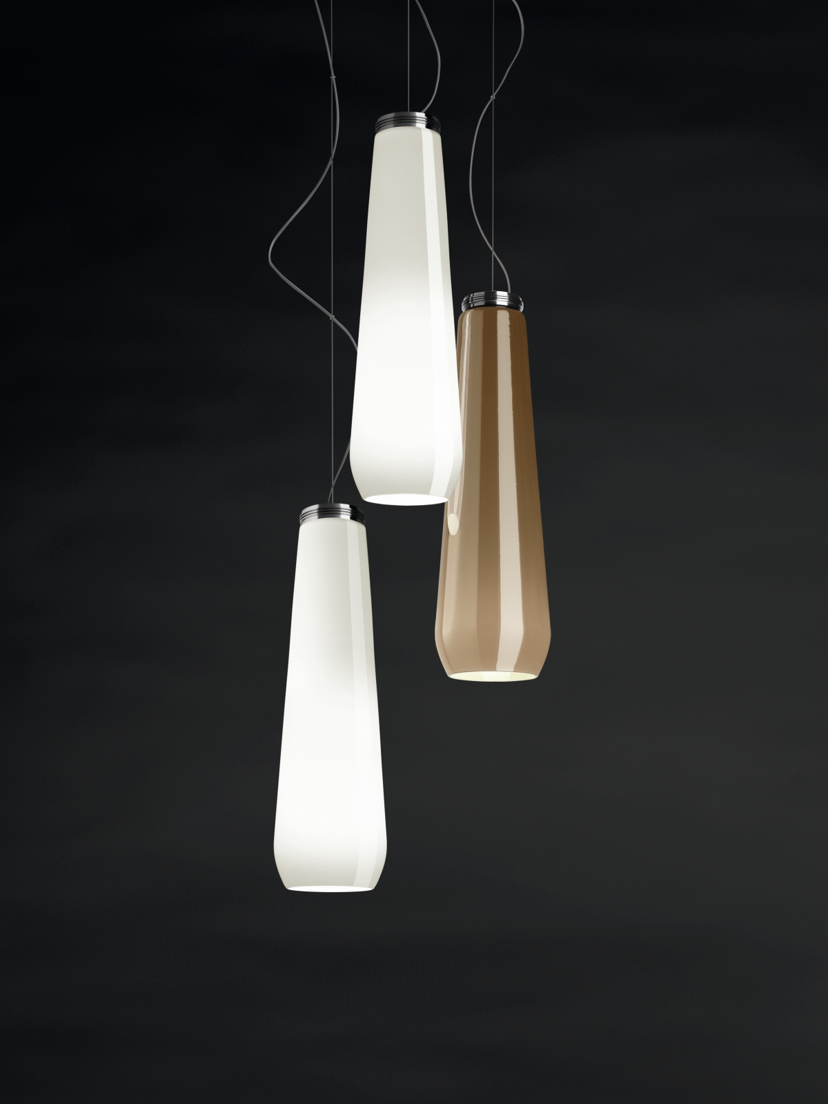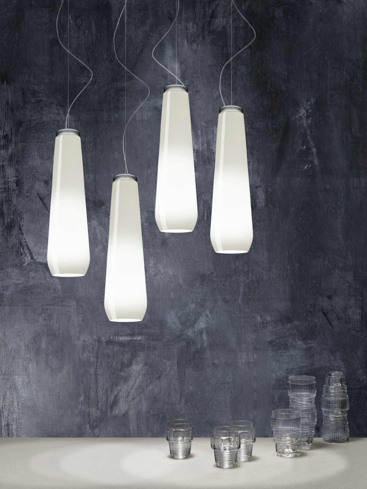 Oltre che dall’inconfondibile forma affusolata, che suggerisce la creazione di allestimenti a grappolo, la famiglia Glass Drop è caratterizzata da un’estrema versatilità di composizione e ambientazione: in una dimora contemporanea o in un ambiente di tendenza, anche abbinando le due versioni bianca e cromo, per dare vita a un magico gioco di luminosità intense e riflessi a specchio, dal dirompente effetto scenografico.