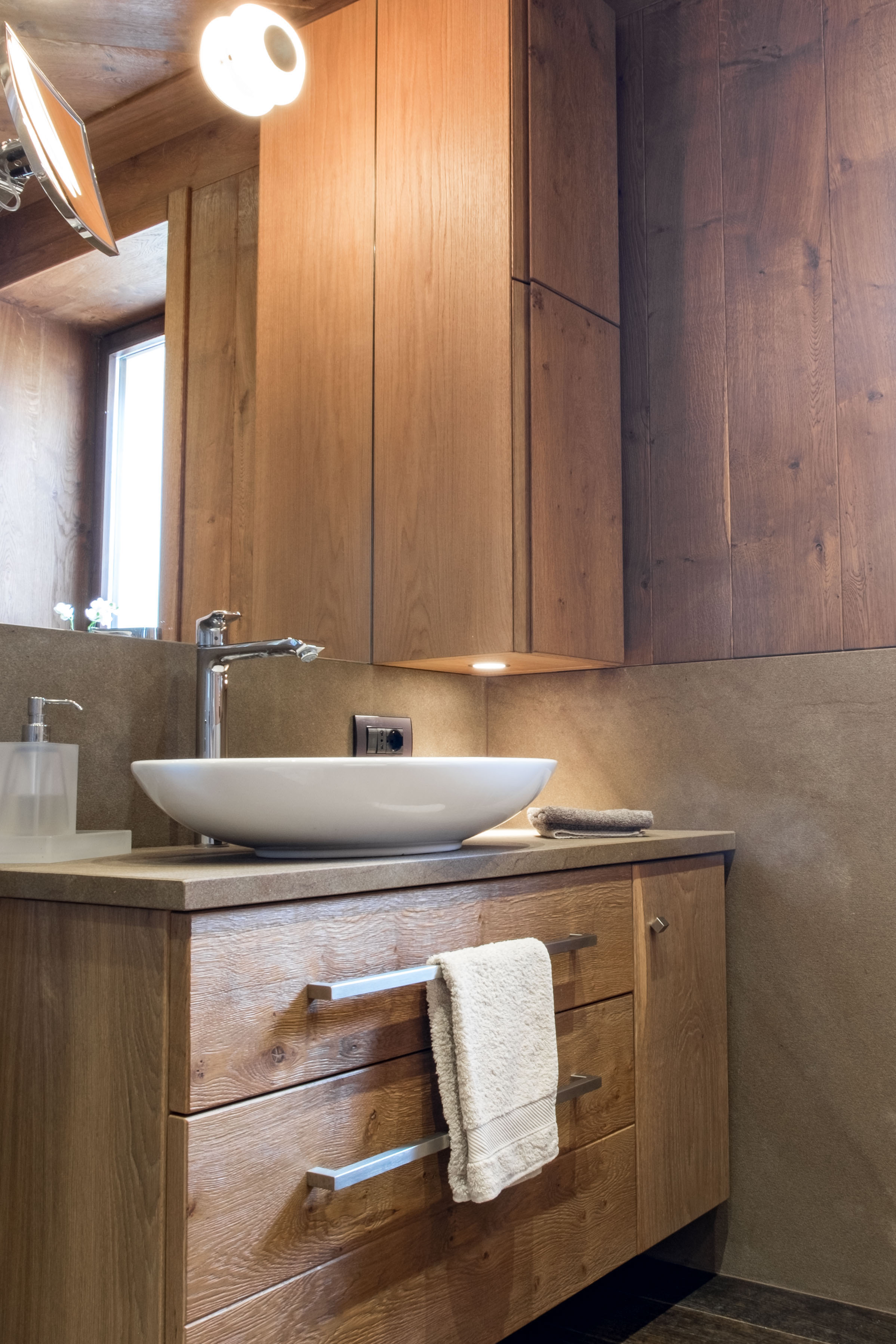 L’essenza scelta per gli arredi, i rivestimenti delle pareti e i controsoffitti è il rovere spazzolato, tinta Dolomia Brown con finitura ad olio, un legno e una finitura capaci di creare un’atmosfera calda ed accogliente.