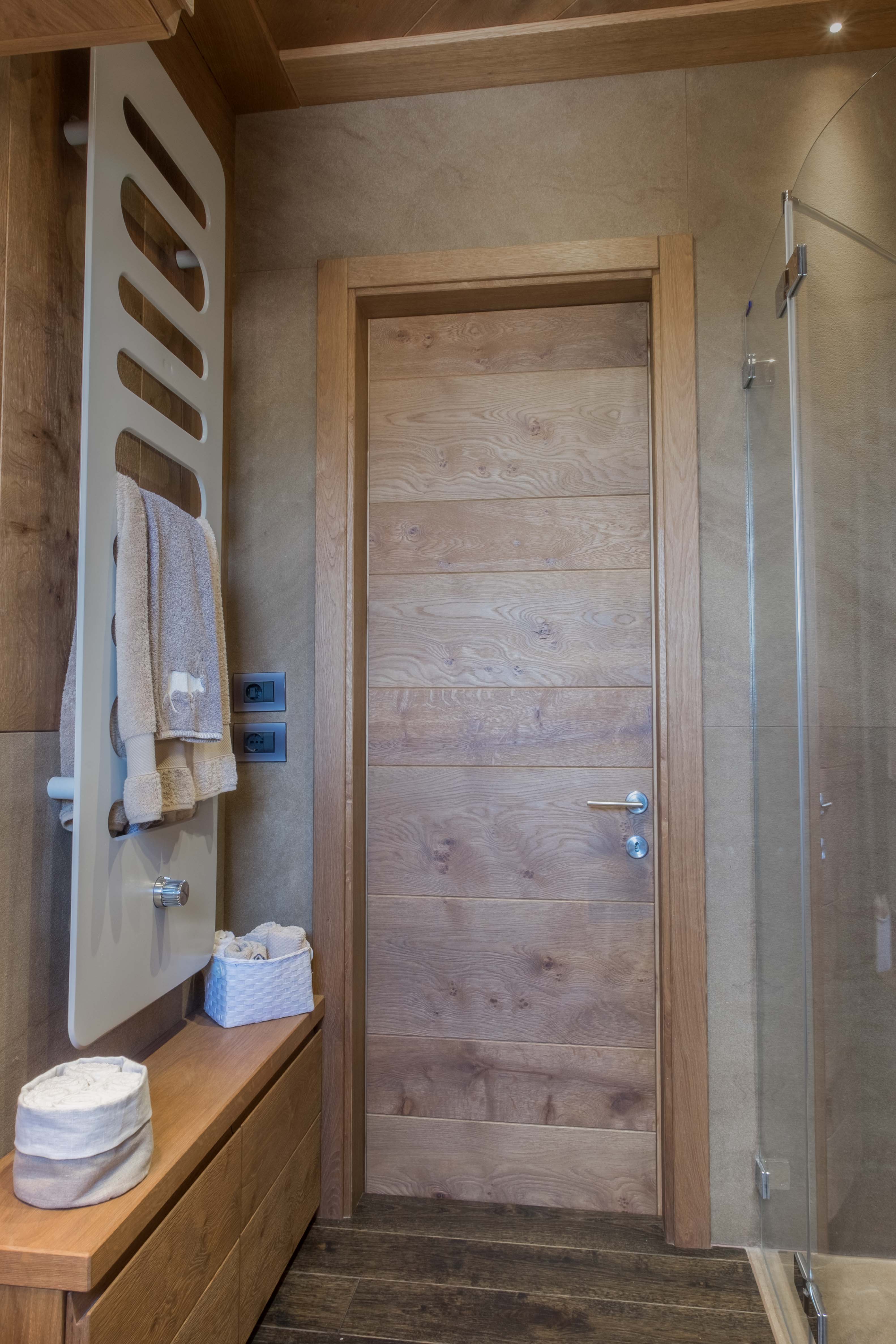 Il rovere, nel formato dogato, è stato utilizzato anche per il rivestimento interno della porta e per il controsoffitto dove è stata scelta una soluzione a doghe diagonali con illuminazione integrata a faretti, per dare un maggiore senso di ampiezza dello spazio.