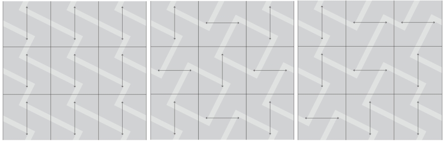 La superficie così cambia sotto i nostri occhi attraverso semplici variazioni di posa e l’occhio si perde in labirintici effetti zig-zag, speculari , simmetrici o casuali, restituendo, come dice Giulio Iacchetti, “un senso di infinito, uno sviluppo grafico senza confini…”.