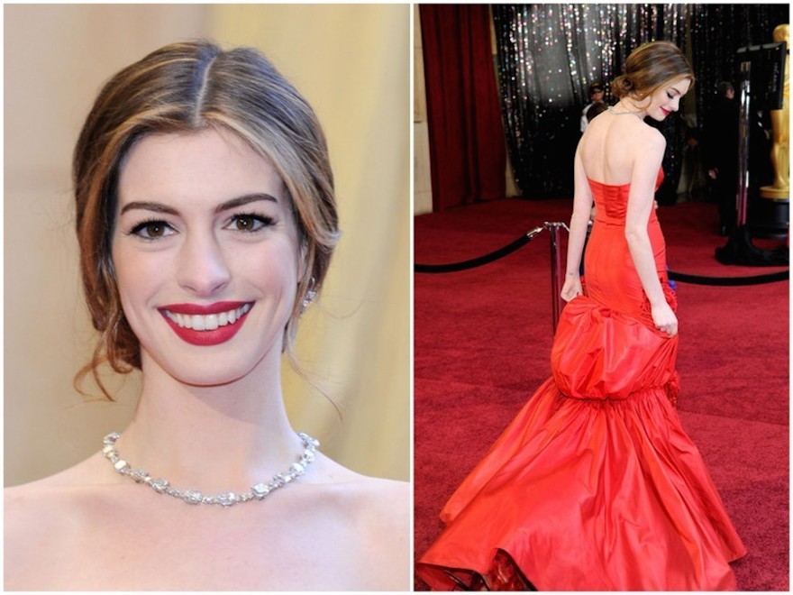 Per gli Oscar del 2011 invece l’attrice Anne Hathaway ha indossato 10 milioni di dollari in gioielli in oro, tra cui una collana di Tiffany & Co. con 94 carati di diamanti, un anello di diamanti Tiffany Legacy, e orecchini di diamanti da 10 carati. Va inoltre aggiunto che l’attrice è stata pagata 750 mila dollari da Tiffany & Co. per indossarli.