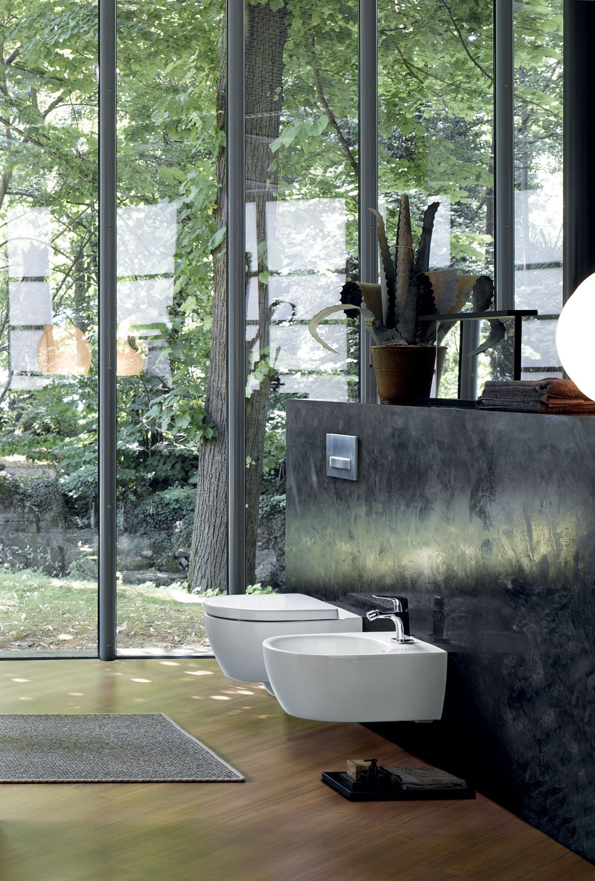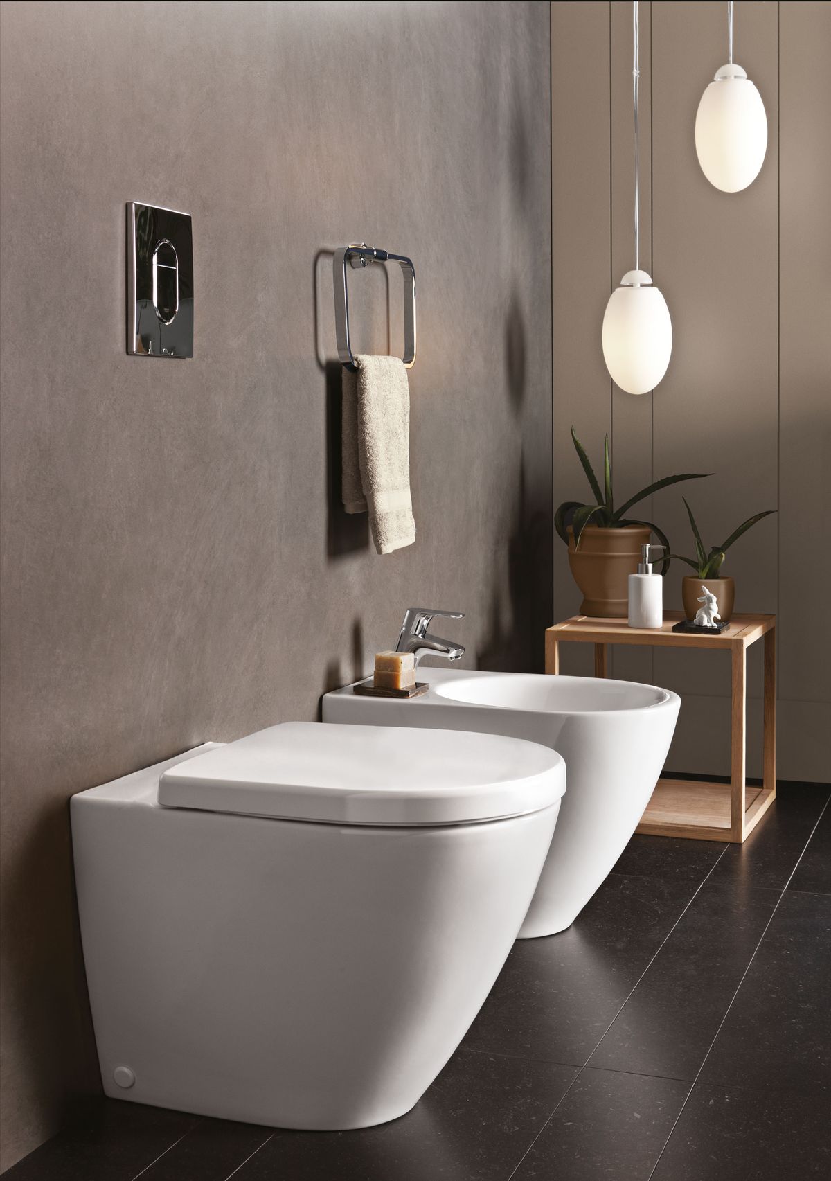pozzi ginori fast vaso sospeso con tecnologia rimfree e bidet sospeso, in abbinamento la placca di comando geberit sigma50