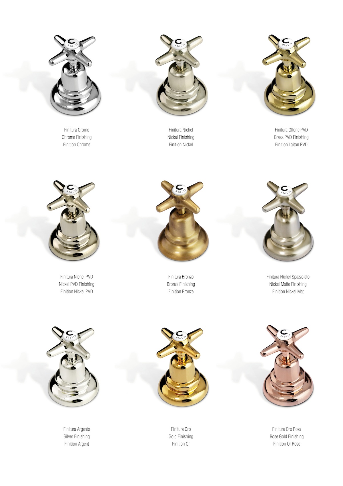 Infatti ciascuna delle finiture, applicabili a tutte le serie, è stata studiata per esaltare lo charme dei prodotti: il Cromo per accentuare la classicità, l’Argento e l’Oro per impreziosire, il Bronzo e l’Ottone per valorizzare il tono retrò, ed il Nichel, proposto nelle varianti Nichel PVD e Nichel spazzolato, per un effetto modern retro dai toni più sofisticati.