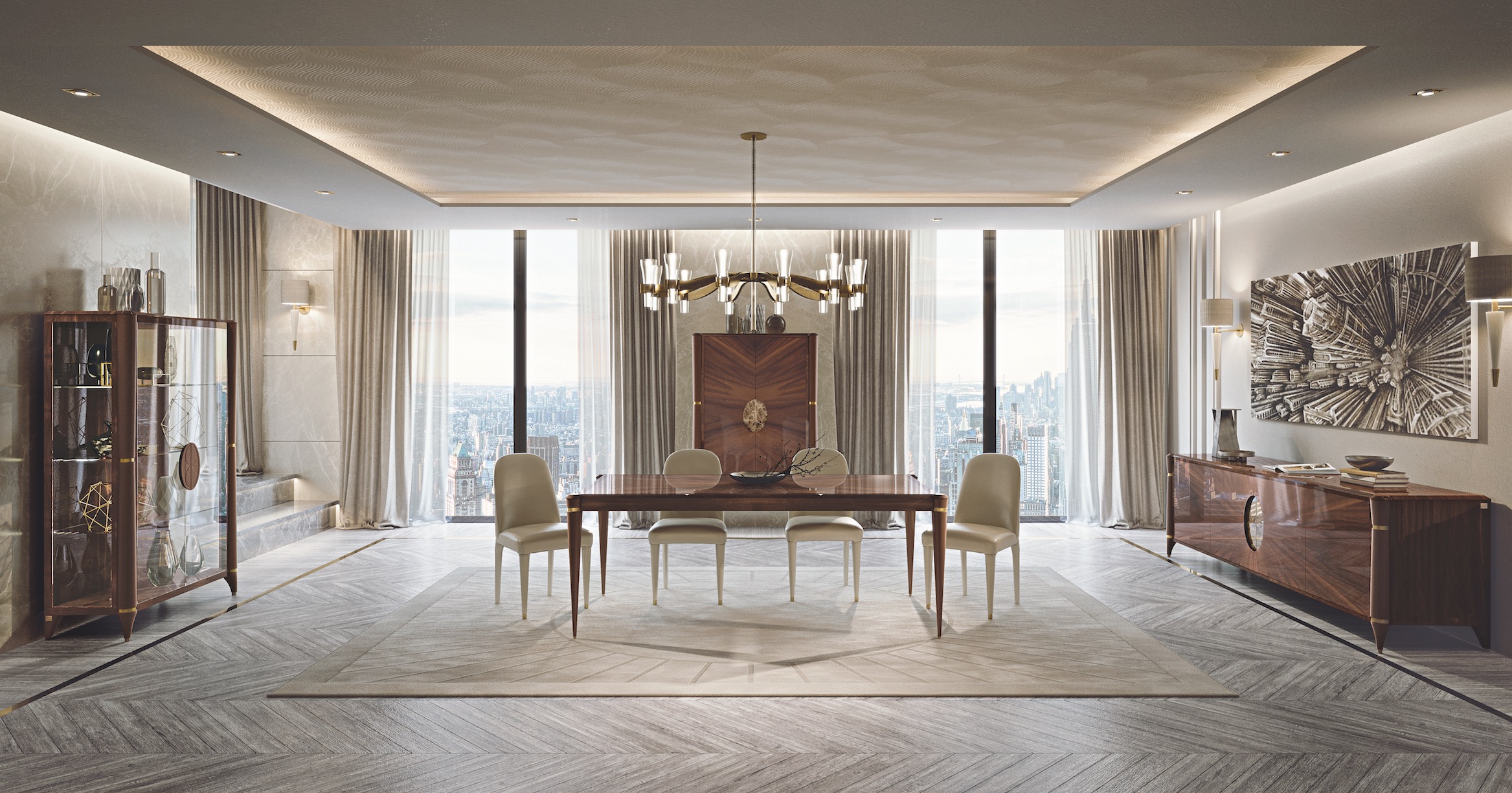 Ulteriore novità è l’introduzione di un nuovo modello di sedia e di basamento del tavolo rotondo, rivestiti completamente in pelle arricchita da cuciture realizzate a mano e che richiamano il motivo ad ellisse proprio della collezione. Anche sui frontali dei cassetti della cabina armadio, sui cuscini e gli schienali del divano e delle poltrone, è possibile riportare questo leit-motiv.