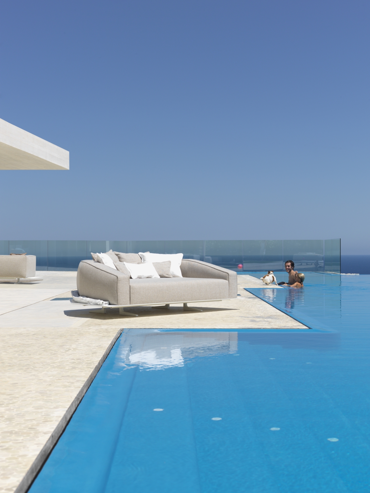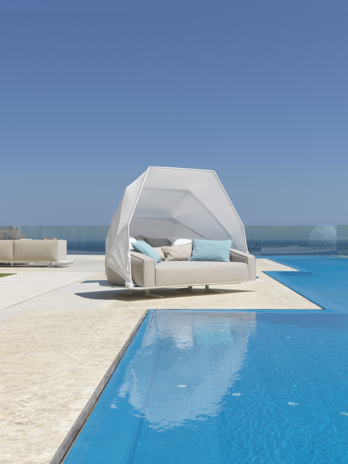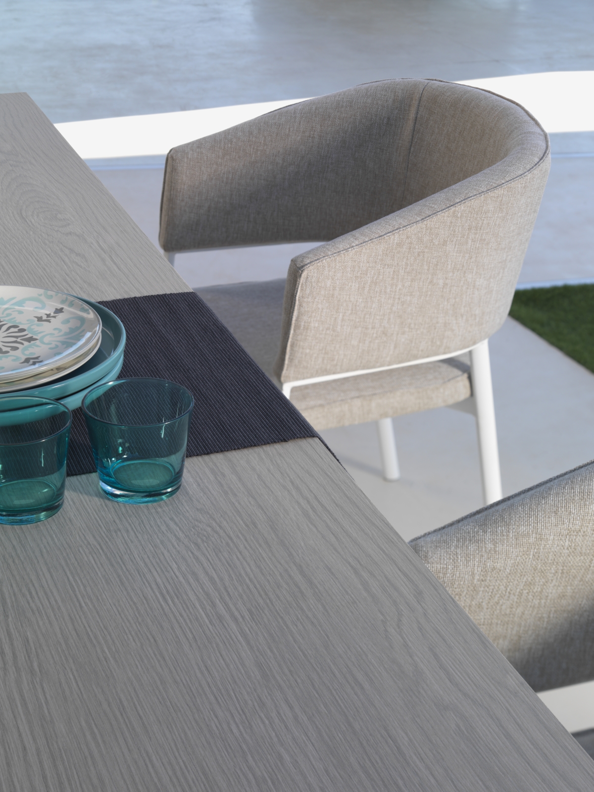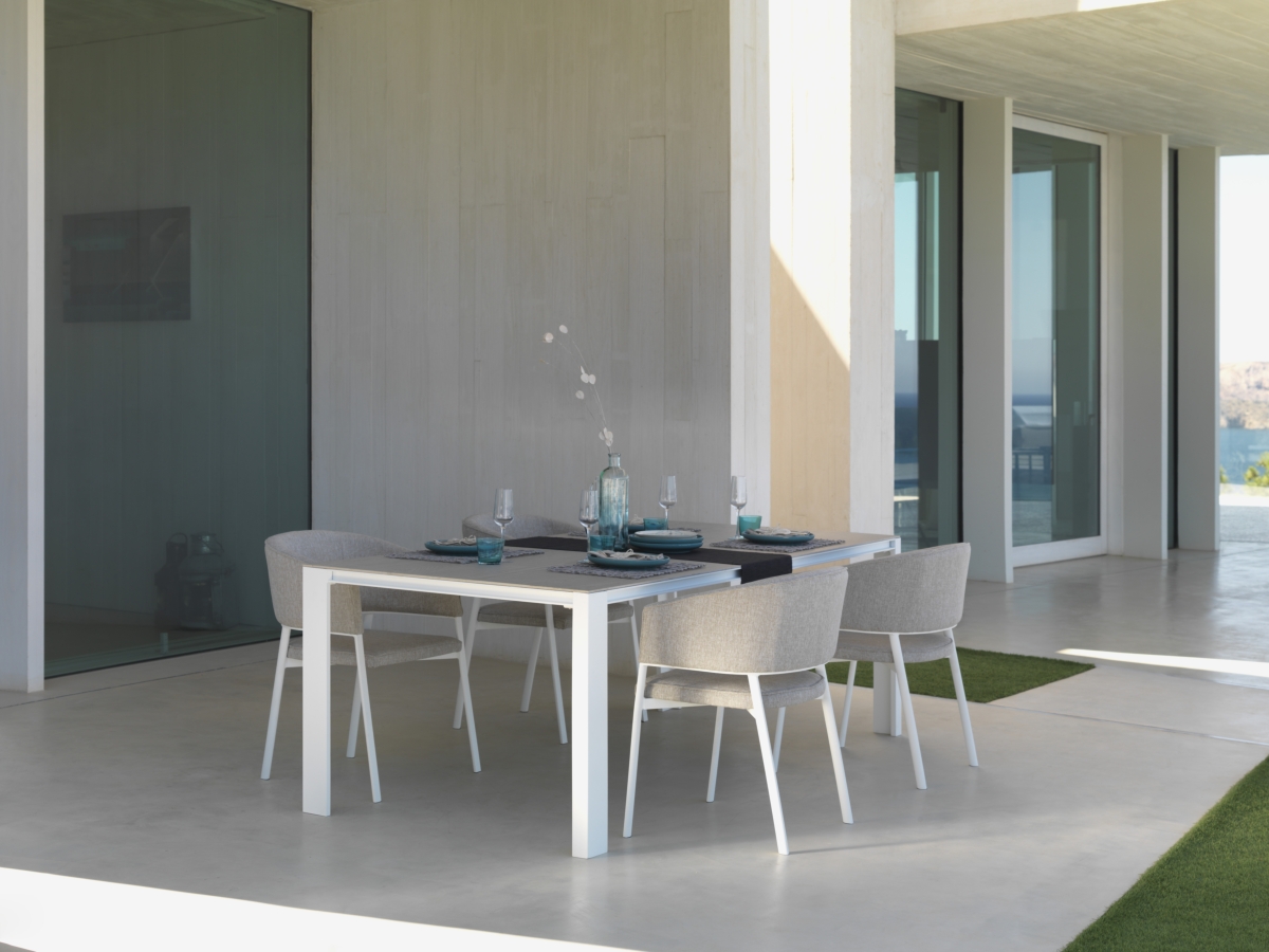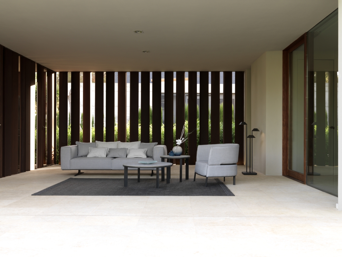 Dolcevita e Para Tempotest – le due varianti di tessuti utilizzati, si combinano ad uno stile che si conferma ricercato, seducente e che trasmette una sensazione di leggerezza propria dell’outdoor, rimarcata ulteriormente dalla combinazione di acciaio inox, marmo e legno.