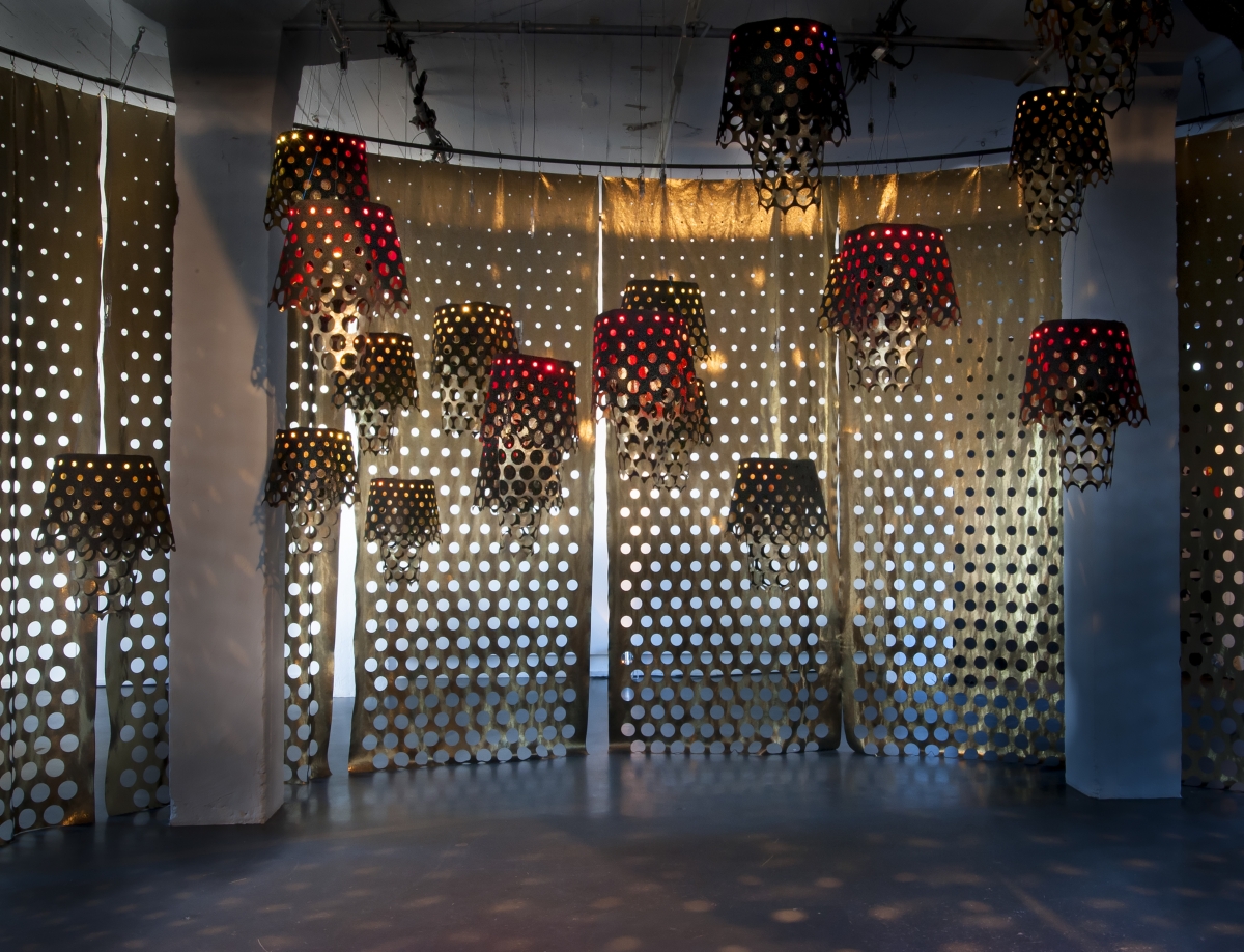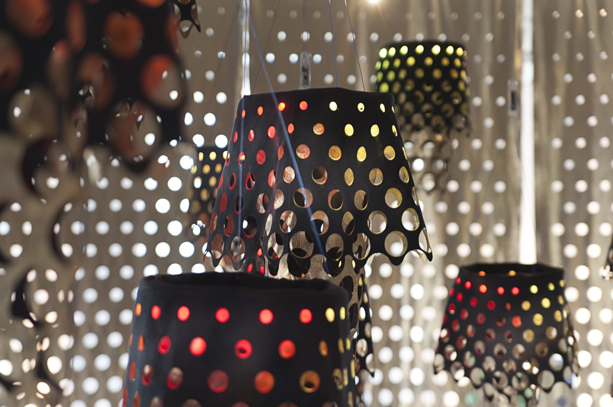 È un raffinato lavoro sulla tecnologia quello pensato da Moritz Waldemeyer per 火曜日 kayoubi. L’ingegnere e designer anglo-tedesco propone una installazione costituita essenzialmente da paralumi: applicando uno strato extra di pellicola ad una particolare variante forata di Alcantara®, Waldemeyer ha creato una texture che, combinata alla luce, trasforma il materiale in qualcosa di ricco e prezioso.