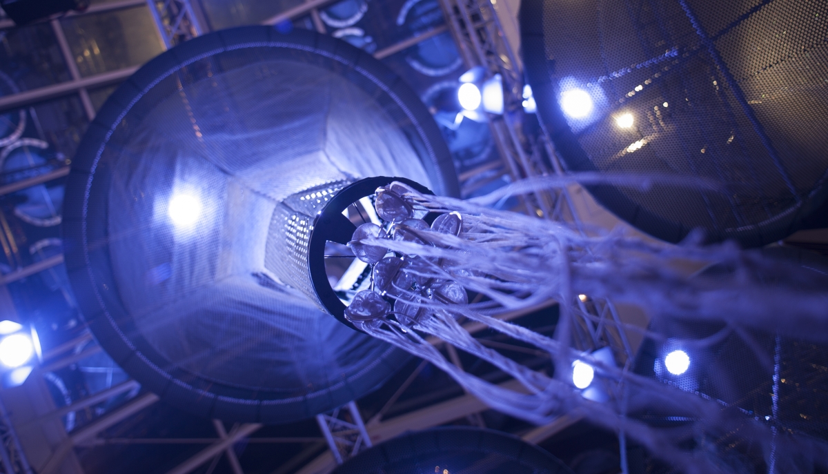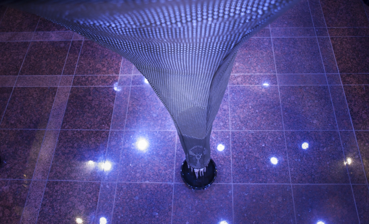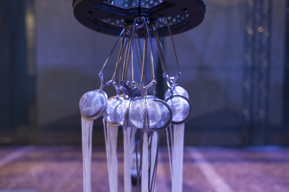 The Science Spooner, installazione pensata dall’eclettico designer danese Henrik Vibskov per lo spazio in fiera, richiama alla mente un esperimento da laboratorio scientifico: all’interno di una sorta di scatola rettangolare, delimitata da una tenda in Alcantara®, Vibskov pone 15 coni pendenti dal soffitto, rivestiti in varie gradazioni di verde del materiale. Muovendosi dall’alto al basso grazie ad un meccanismo motorizzato, questi arrivano a toccare, con un’estremità appuntita, un contenitore di vetro contenente acqua, creando un singolare effetto sgocciolamento. I LED interni che traspaiono dai fori praticati sui coni regalano una luminosità discreta e ammaliante.