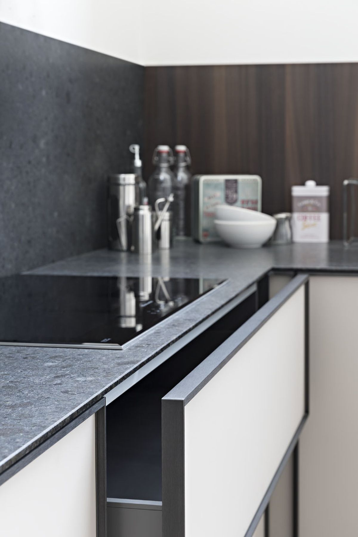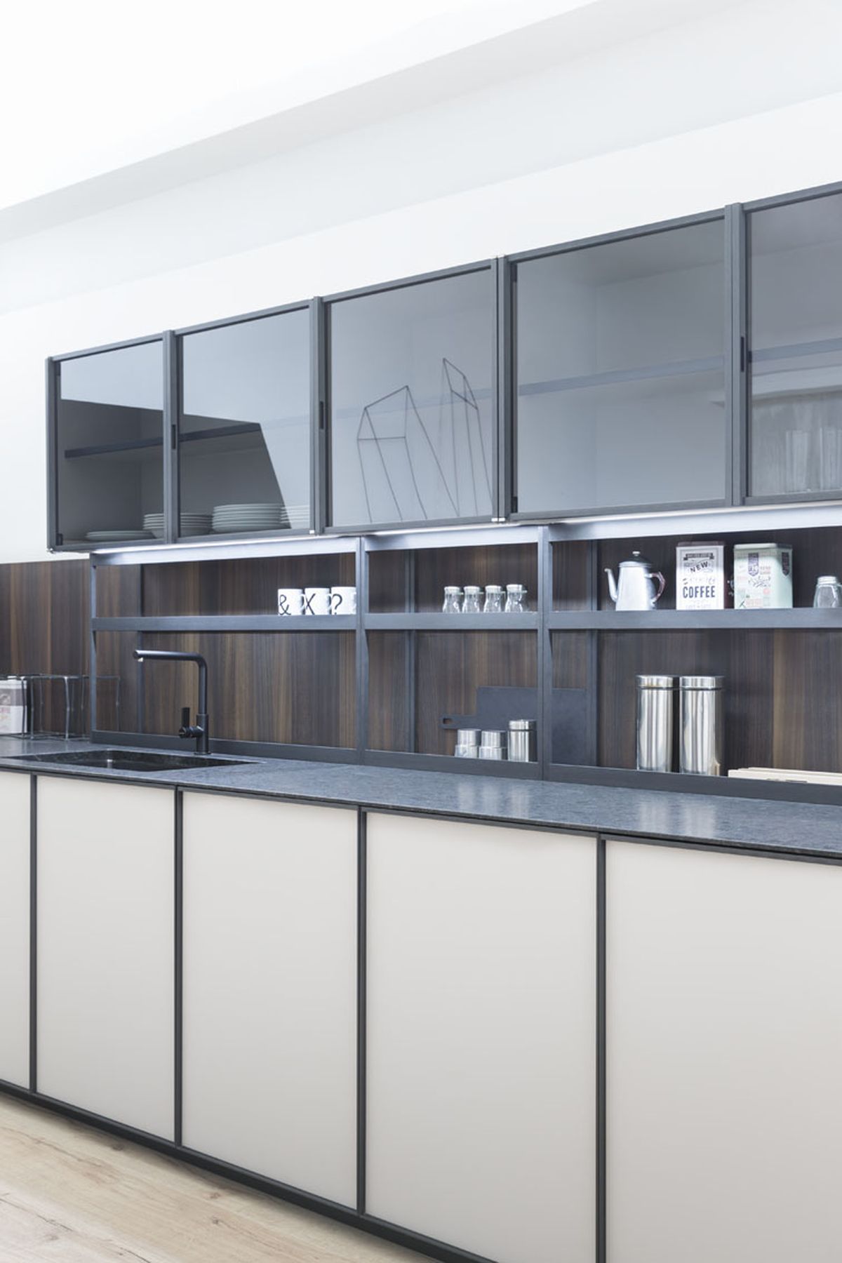La grande novità di XP è rappresentata dall’anta altamente tecnologica con telaio strutturale in alluminio in finitura ossidato nero, che ospita un pannello di 4 mm disponibile in diversi materiali – essenza, vetro, laccato, laminato, alluminio.