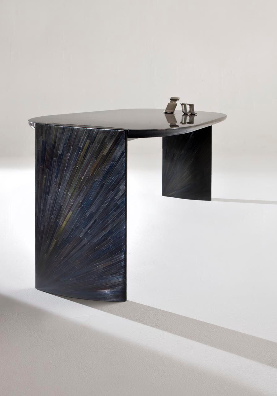 Ispirati agli antichi scrittoi, riletti con essenzialità e leggerezza, possono essere collocati al centro della stanza oppure in un angolo, con qualsiasi orientamento e l’idea di raccoglimento con sé stessi è rappresentata dalla forma arrotondata del piano.