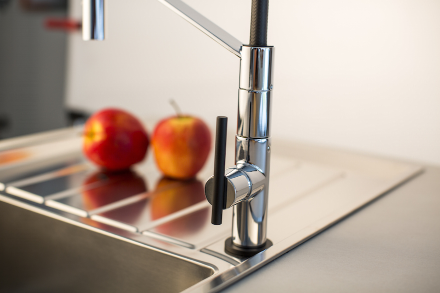 L’eleganza contemporanea del nero matt e del bianco matt valorizza lo stile dell’ambiente cucina grazie alla Linea 34 di Gattoni Rubinetteria.