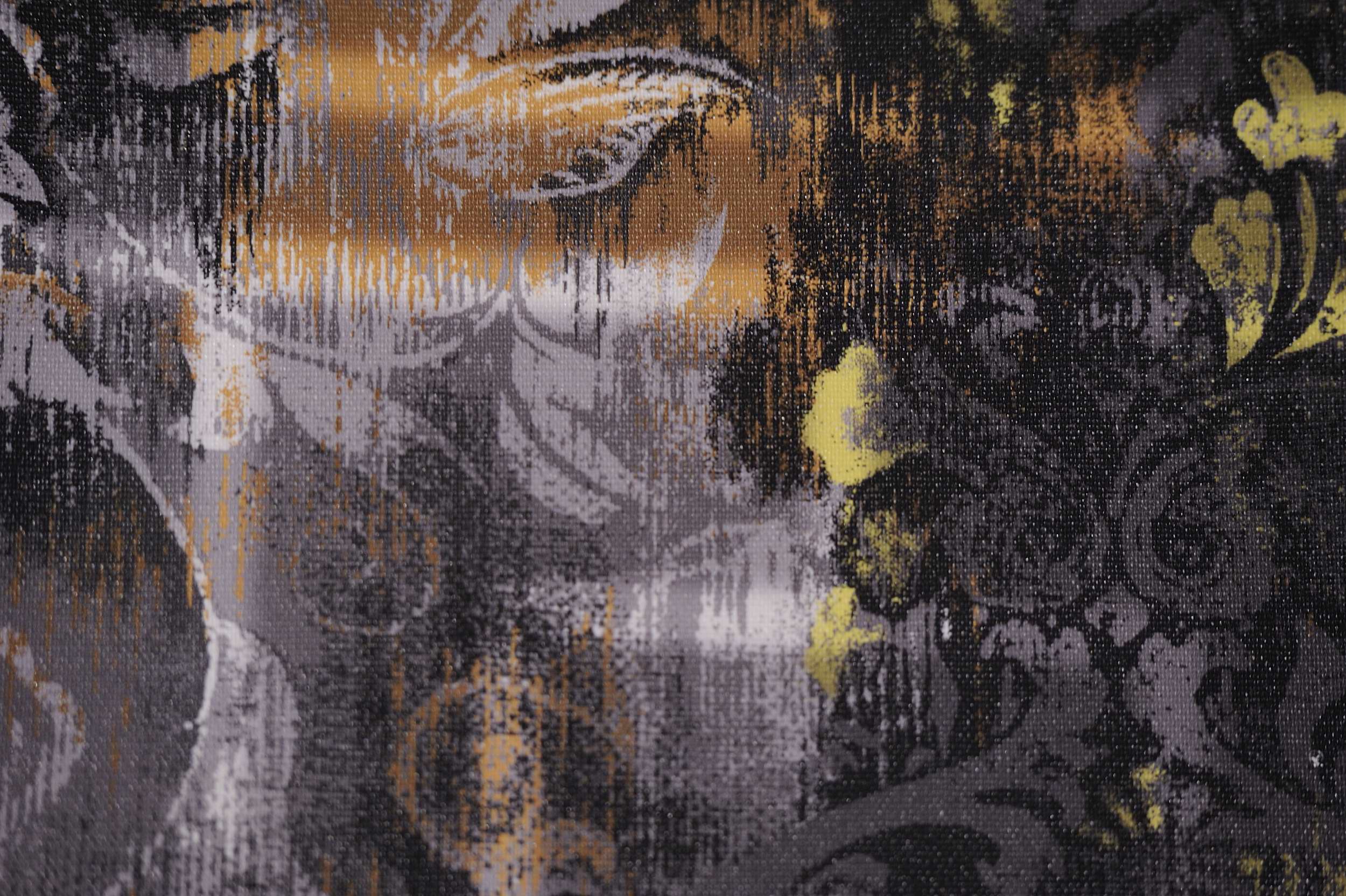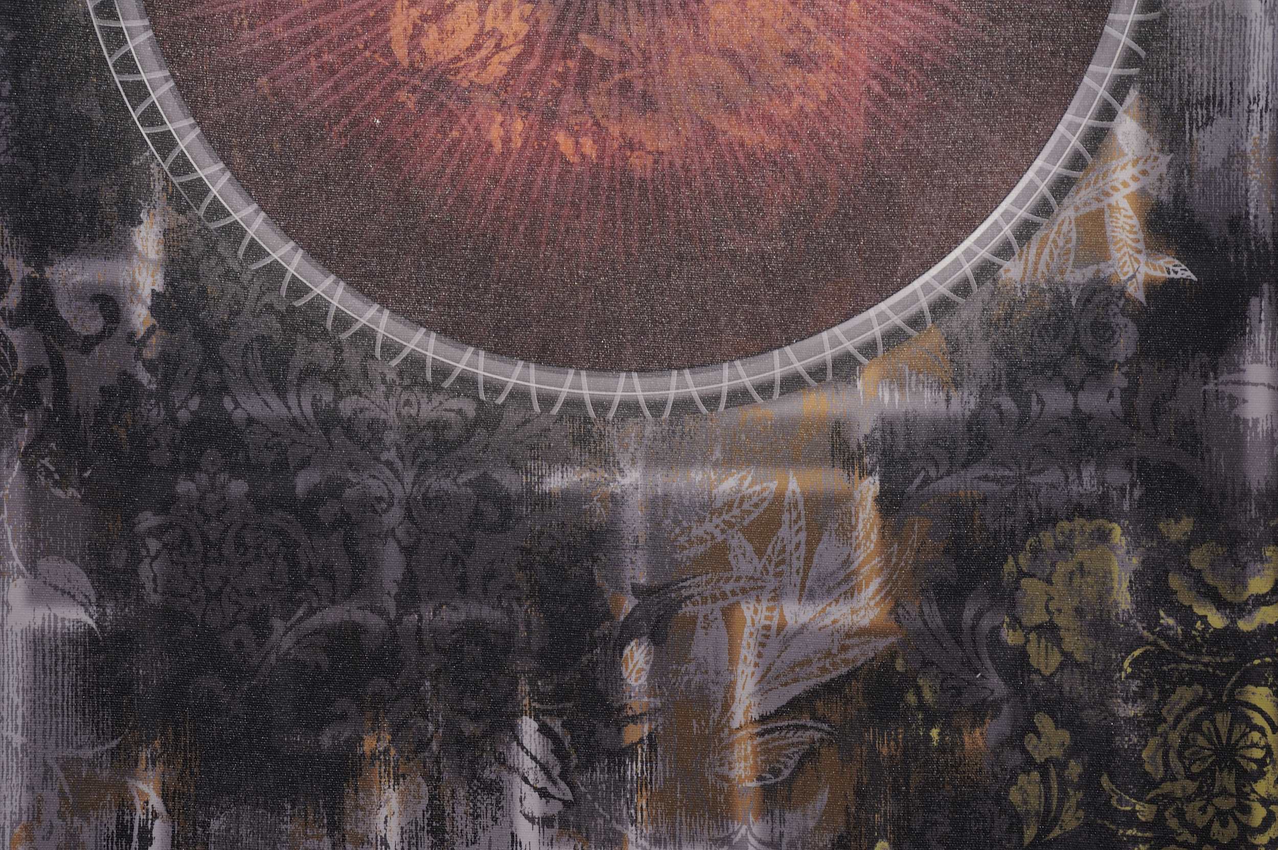 Un evidente e palese omaggio alla Monna Lisa, riconosciuta tra i più celebri simboli dell’arte in tutto il mondo, e riproposta poi anche dall’artista Dadaista Marcel Duchamp. L’incontro tra un decoro di fondo estremamente moderno, che ricorda i circuiti elettronici, ed un elemento classico, come il volto della Monna Lisa, delimitato da una figura circolare, dà vita questa carta da parati estremamente moderna e futurista.