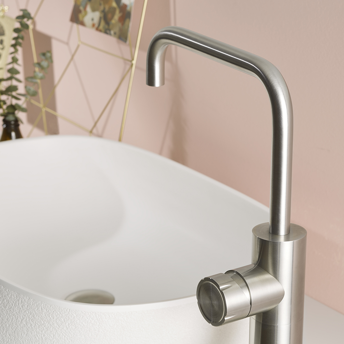 Regolare con cura la temperatura e la portata per raggiungere il comfort ideale rimane il leitmotiv della serie: il comando del rubinetto, un cilindro in acciaio inossidabile arricchito da incisioni ed incavi che permette di dosare perfettamente l’energia del movimento, ne sottolinea il concetto, anche quando è il miscelatore per le colonne doccia, le colonne vasca e le colonne lavabo.