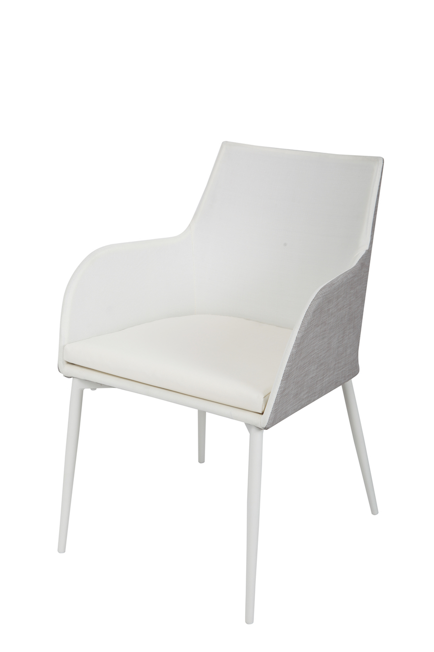 Inoltre, il colore bianco in cui è declinato l’alluminio e la tonalità bi-color bianco / grigio cenere del textilene che riveste le poltroncine donano un tocco ancora più raffinato ed esclusivo alla composizione.