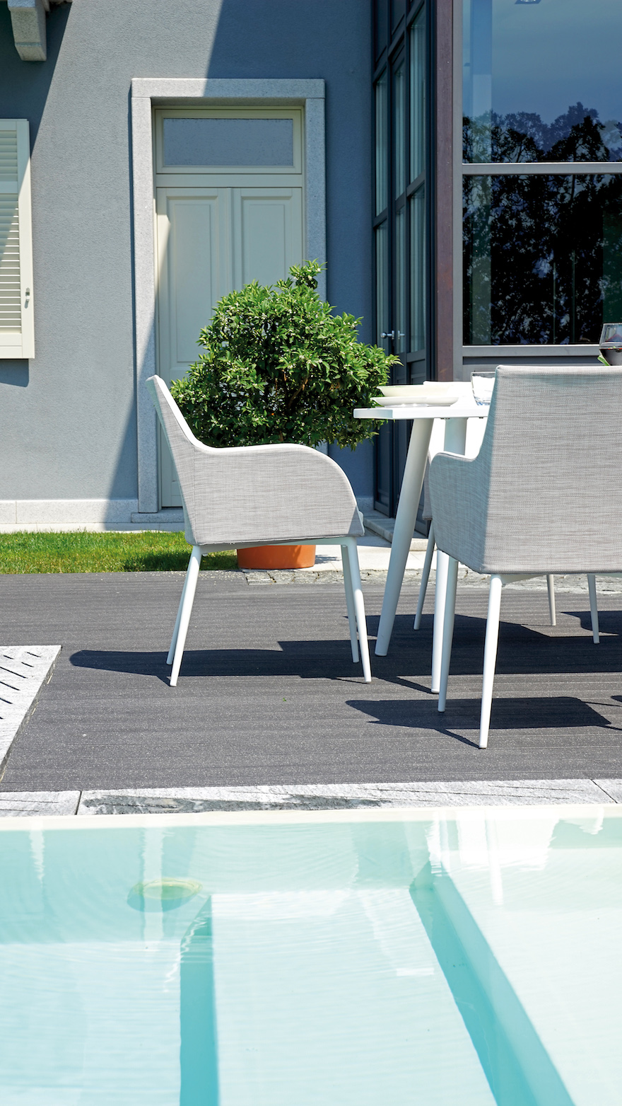 Il profilo sobrio e raffinato del tavolo Andora e della Poltroncina Voltri dona uno stile inconfondibile all’outdoor.