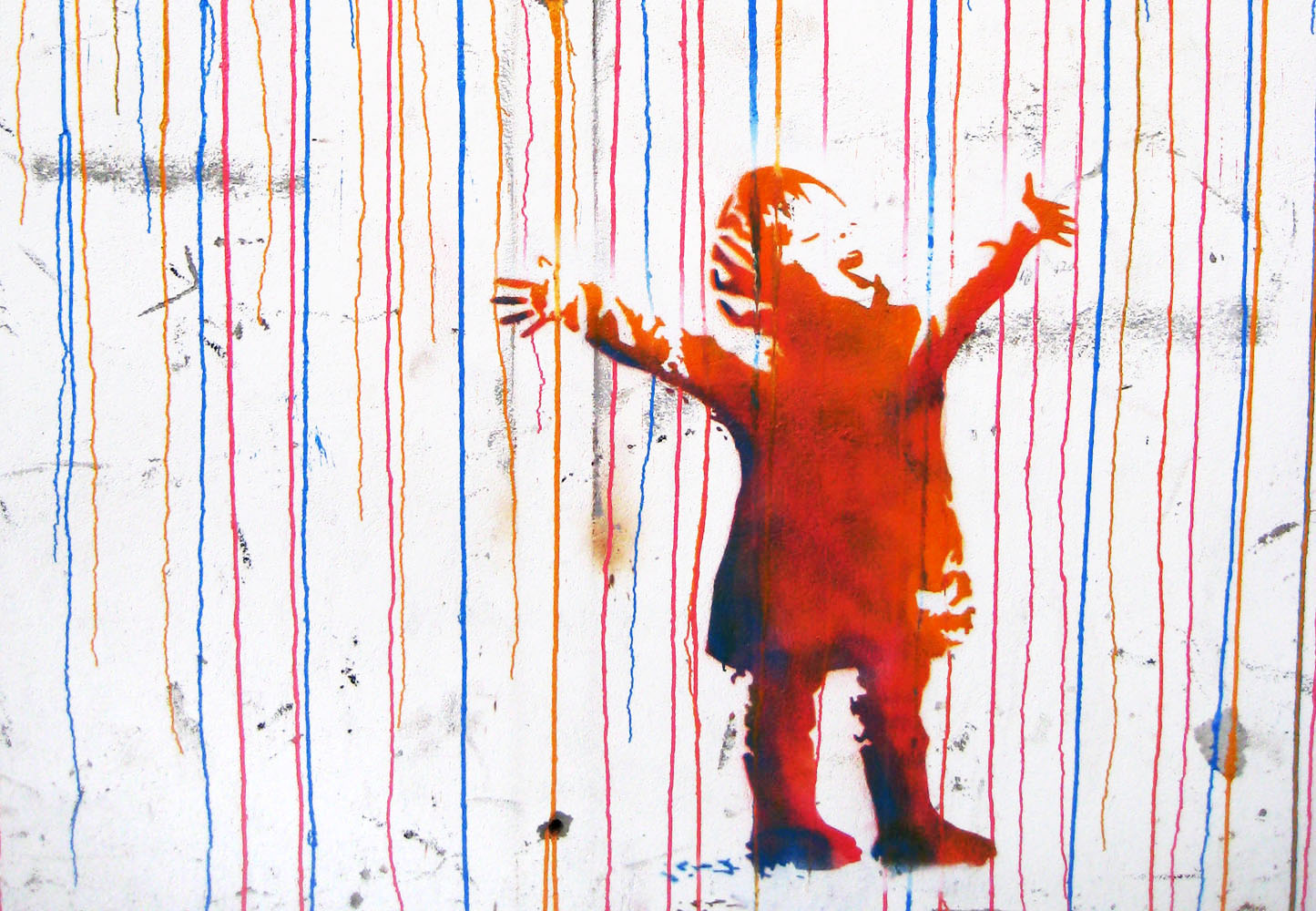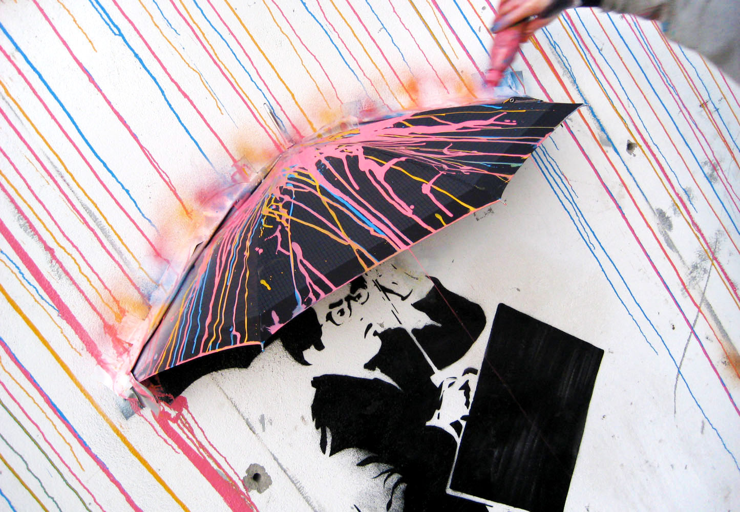 La pioggia colorata cola lungo il muro dell’edificio, le forme piatte dell’uomo e del bambino, riferimenti evidenti all’opera del famoso writer inglese Banksy, interagiscono perfettamente con le gocce di acqua e l’ombrello che sporge dal muro.